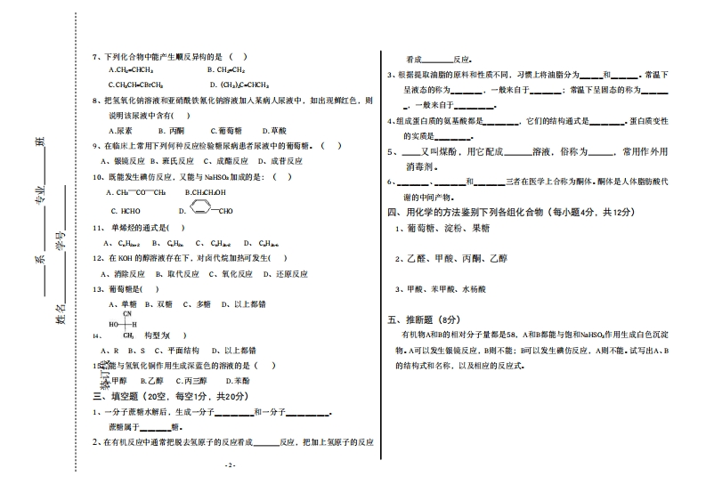 天神大学2017-2018学年第一学期考试试卷13、位D吸喃葡萄幅14.碘仿退望名章:有具化坐试时国20分蛙COOH题号三四五六总分OH15实得分16、R.乳酸CHCH CC CHaCHa评老人17,CH3CH-CH—CH2-CH一、命名或写出结构式(20小题,每小题1.5分,共30分)CHa CHOG一CG具CI CHCIL CIL19乙醇1CH.CH一CH20、丙阴二、选择题(15小题,每小题2分,共30分)部21、经指的是()A,含碳元素的化合物B、只含碳、氢元素的化合物3、C、含碳、氢元素的化合物D、警烧不只生成C0和HO的化合物CH--CHO2、下列化合物沸点最高的是()4.CH,--CH-CH-COOHA.CHCH CHCHCHa B.CHCH(CH)CHCH拟C、(CH)CD、CH CHCHCH6、乙酸肝3、下列化合物是乙醇的同分异构裤的是()7、2羟基丙酸A,甲醇B、甲酰C甲乙酰D、乙醚数8学硝基米4、能与斐林试剂反应的有机化合物是()瑞。氨基丙酸A,苯甲醛B、苯甲醇C、丙阴D、2甲基丙醛5、能发生银镜反应的是()10、从甲基米胺A、甲醇B、甲酰C甲苯D、甲酸11,呋喃6、能与PC3发生显色反应的是()12.乙醚A、甲苯B、水杨酸C、乙酰D、养甲酸