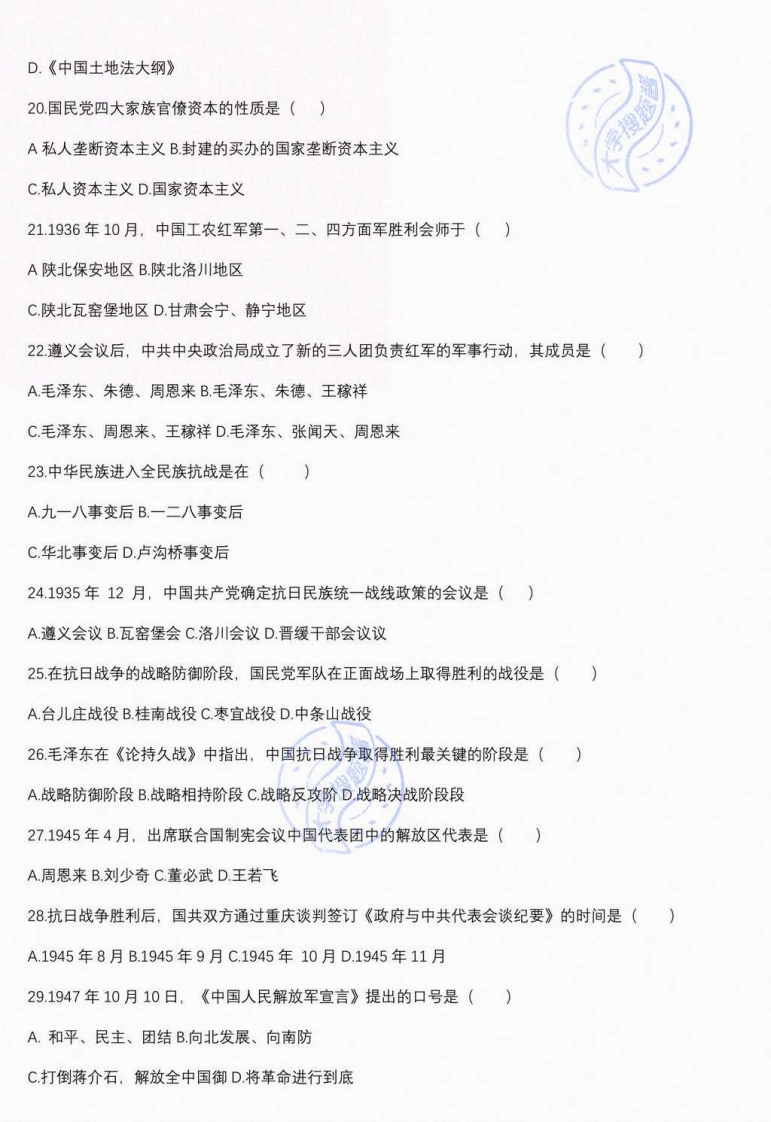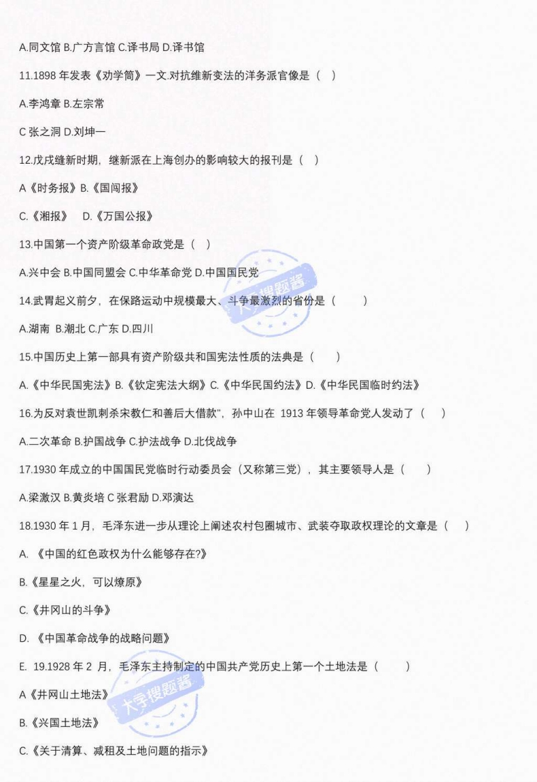 天津工业大学2020一2021学年第一学期期末考试《中国近代史纲要》期末考试试卷(时间120分钟)开课院(系、部)姓名学号一、单项选择题(本大题共30小题,每小题1分,共30分)1.鸦片战争前中国封建社会的主要矛盾是()A地主阶级和农民阶级的矛盾B.帝国主义和中华民族的矛盾C资产阶级和工人阶级的矛盾D封建主义和资本主义的矛盾2,中国封建社会产生过诸多盛世”,出现在清代的是()A文景之治B.贞观之治C.开元之治D.康乾盛世3将中国领土台膏割让给日本的不平等条约是()A.《南京条约》B.《北京条约》C.《马关条约》D.《暖理条约》4西方列强对中国的侵略,首先和主要的是()B.军事侵略A政治控制C经济辣夺D.文化渗透5.1839年组织编写成《四满志》,向中国人介绍西方情况的是()A林则徐B.魏源C,马建忠D.郑观应6.19世纪末,在帝国主义列强瓜分中国的狂潮中提出门户开放“政策的国家是(〉A俄国B.日本C美国D德国7太平天国农民起义爆发的时间是()A.1851年B1853年C.1856年D.1864年8太平天国由盛而衰的转折点是()A永安建制B.北伐失利C天京事变D.洪秀全病逝9最早对兴办洋务的指导思想作出完整表述的人是()大字搜题酱A冯桂芬B.马建忠C王韬D.郑观应10.洋务运动时期最早创办的翻译学堂是()