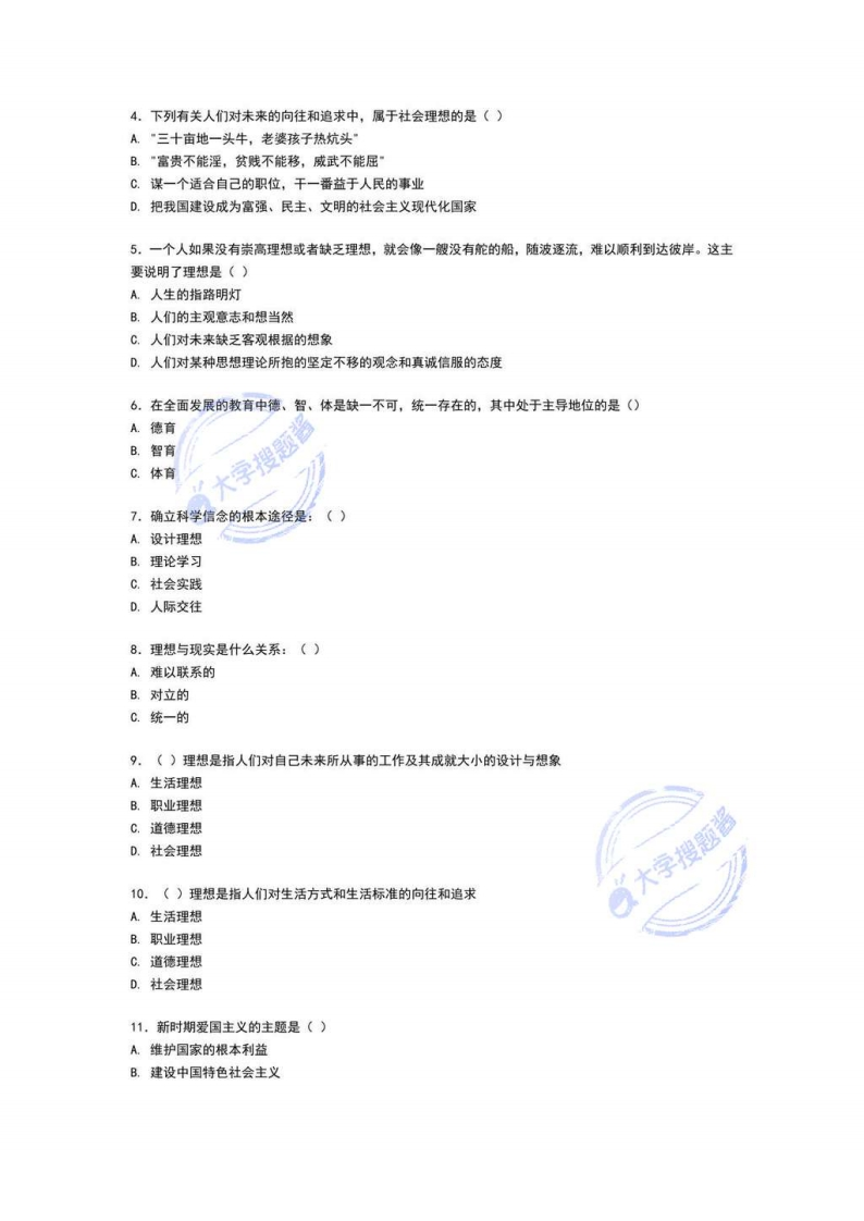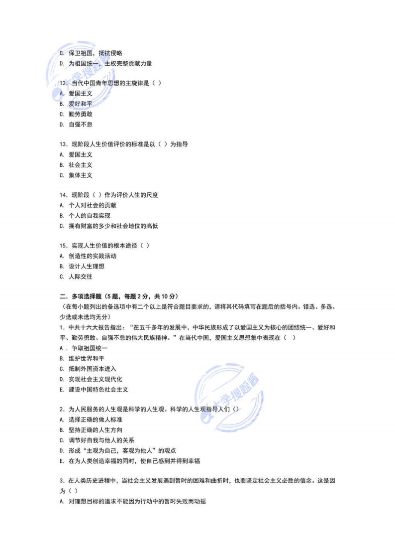 天津师范大学2020-2021《思想道德与法治》试题(C卷)开卷()闭卷(√)适用专业年级:各专业姓名学号专业班级注:1.答题前,请准确、清楚地填各项,涂改及模糊不清者、试卷作废。2.试卷若有雷同以零分计。总分题号三四五六阅卷人题分核分人得分一,单项选择题(15题,每愿2分,共30分)(在每小题列出的备选项中只有一个是符合题目要求的,请将其代码填写在题后的括号内。错选、多选或未选均无分)1,人生幸福需要心理健康,事业的成功需要心理健康,现代社会生活更需要心理健康。心理健康指的是0A心理情绪不急不躁B.思维正常,体格强壮C.体质好,身体无疾病状态D.一种持续的、积极的心理状态2.善于在社会生活中,在自然界和文学艺术中发现、欣赏美的能力是0A.创造能力B.审美能力C.识别能力D.想象能力3.人生价值是自我价值和社会价值的统一。人生的社会价值主要表现为()A.社会对个人的尊重和满足B.个人对自己生命存在的重视C.社会舆论对个人的积极评价D.个人通过劳动、创造为社会和人民所做的贡献大学