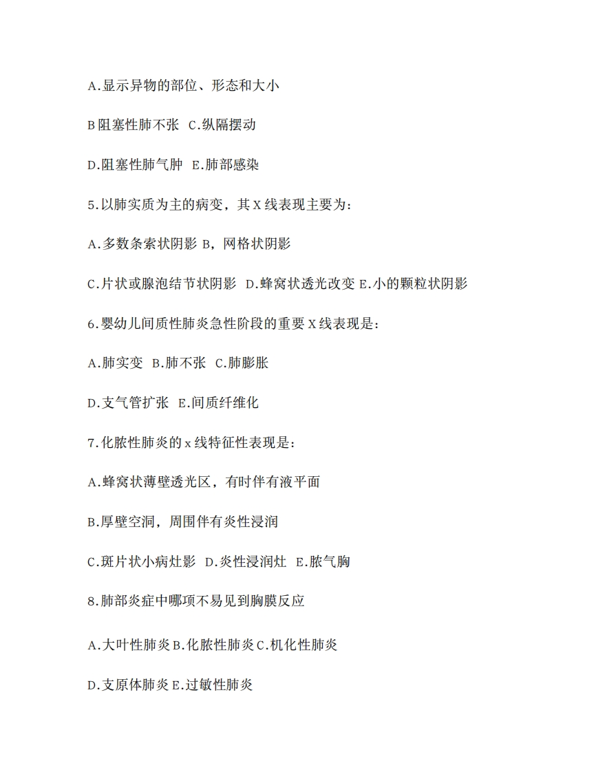 天津医科大学2020-2021学年第二学期《影像诊断学》期末试卷每一道考题有A、B、C、D、E五个备选答案,请从中选择一个最佳答案。1.常见钡剂造影胃的形态不包括A.牛角型B.无力型C.鱼钩型D.瀑布型E.囊袋型2.平片显示率最高的生理性钙化是A.松果体钙化B.脉络丛钙化C.大脑镰钙化D.基底节区钙化E.其他3.右侧支气管异物致呼气性活瓣阻塞时,纵隔摆动的方向是:A.吸气时纵隔向左移动B.呼气时纵隔向右移动C.吸气时纵隔向右移动,呼气时不动D.呼气时向左移动,吸气时向右移动E.呼气与吸气时均不见摆动4.支气管异物的直接X线征象为: