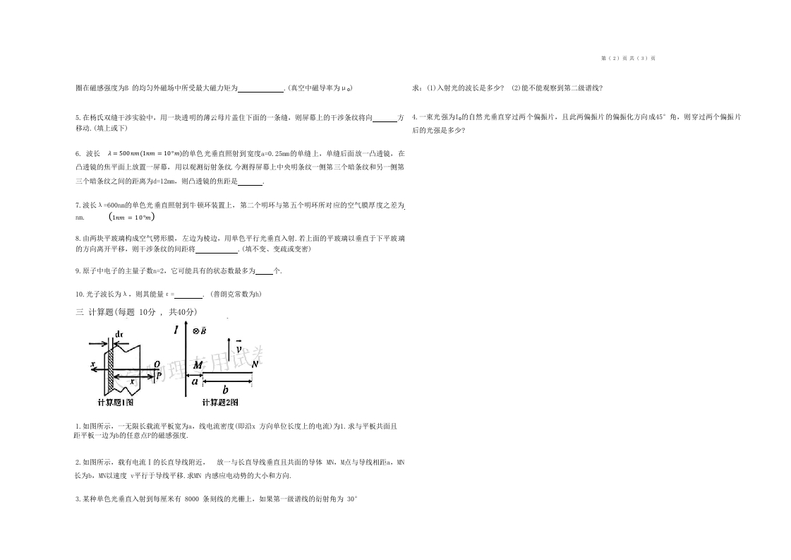 尼球批天津医科大学临床医学院《大学物理》20232024学年第一学期期末试卷#(严禁外传)与式专耳(”禁外)试题卷:6在折射率为168的平板玻璃表面徐一层折射率为18的透明薄腹,可以碱少玻璃表面的反射光,若用被长2=500nm(m=10如)的单色光垂直入射,为了尽量减少反射,则F薄膜的最小厚度应是[一选择题(每题3分,共30分)(90.6en)781n0181.2nD)156.3n067.自然光以布儒斯精角由空气入射到一玻璃表面上,反射光是[)在入射面内挥动的完全线偏根光平行于入射面的根动占优势的部分偏根光(©垂直于入射面银动的完全浅偏根允D)垂直于入射面的银动占优势的部分偏报允选拼圈2图选择愿3阁&关于不确定关系卫,4x≥一,有以下几种理解:a粒子的动量不可能确定.b)粒子的坐标不可能确定.)轮子的1.下列关于磁感应线的掉述,正确的是[动量和坐标不可能具时准确地确定。团不确定关系不仅话用于电子和光子,包话用于其它轮子,其中正确的是[])条形磁铁的磁感应线是从N极到S极的。)条形磁铁的磁感应线是从S极N极的0a.6).(B)(e).(d).0a,d.b)。①.C©磁感应线是从、极出发终止于S极的由战D)磁感应线是无头无尾的闭合由战9氢单子中处于如找态的电子,掉述其量子老的四个量子数血,1,,,)可能取的值为[]2如图所示,平服电容器(忽略边缘效应充电时,沿环路,的磁场程度阳的环流与沿环路L:的场程度百的环流再者,必有[0221.-1/2.20,0,1/2).C21,-1,-1/2)20.1,1/2()更币i>更币面()∮m1Q由氢原子理论知,当大量氢原子处于3的澈发态时,原子跃迁将发出[])一种被长的光再种被长的©三种被长的光D)连续允请i=少币.二填空题(每题3分,共30分)(c)中Hdi<中Hdi.(0)∮A,dl=0.1.平行板电容器的电容用C(单位表示,两板上的电压变化率为山(单位V/s),则该平行板电容器中的位移电流为一及两根无限长平行直导线载有大小相等方向相反的电流1,并各以l/t的变化率增长,一矩形线圈位于导战平面内(如图),则〔2再个蒂电粒子,以相门的速度垂直磁感线飞入匀强磁场,它们的质量之比是1:4,电荷之比是1:2,它们的运动华径之线圈中无感应电流线圈中感应电流为巢时针方肖比是一(©)线圈中感应电流为迎时针方肖D线圈中感应电流方肖不降定及真空中有一个均匀密绕的细长螺线节,卫密度加(单位:更/,螺线节的情藏面积茶(单位:口).当在螺线节中通入4.用战圈的白感系数L表示载流线圈磁场能量的公式w.=-]电流程度I(单位:A)的电流时,它的情藏面上的磁通量为·(真空中磁号率为=。})只话用于单里同线圈只话用于一个里数很多,且密绕的螺线环4.真空中,有一边长知的载流正方形线圈,另有一与之面积相等的载流同线圈,如果同战在其中心产生的磁感强度为©话用于自感系数L一定的任意线圈)只话用于无限长密绕螺线节,且同战圈与正方形线圈的磁矩之比2:1,那么正方形线5在迈克耳孙干涉仪的一条光路中,放入一折射率为,厚度为的透明薄片,放入后,这条允路的光程改变了102a-1)d)2d(c)2(n-)a+-.d