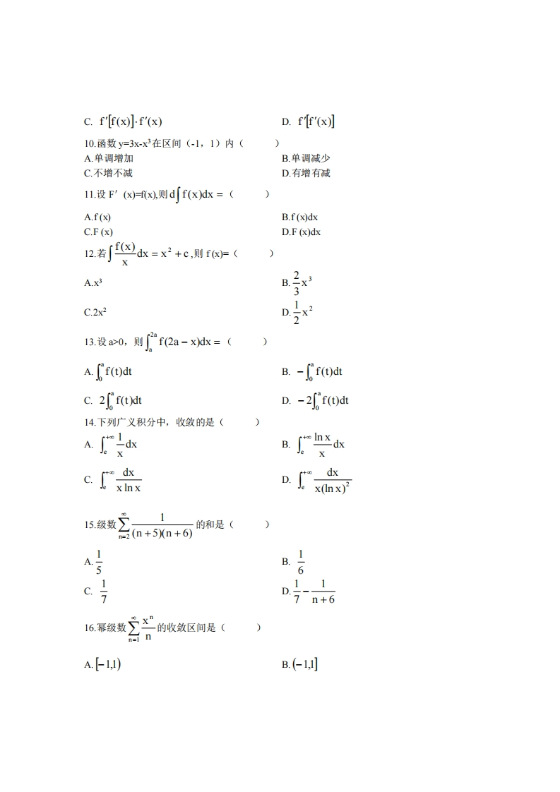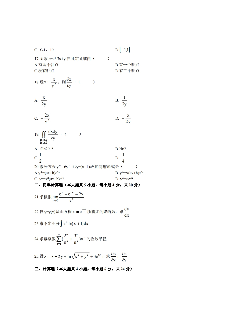 同济大学《高等数学》2020-2021学年第二学期期末试卷一、单项选择题(本大题共20小题,每小题2分,共40分)l.函数y=-(e-ex)是(2A.偶函数B.奇函数C.非奇非偶函数D.奇偶性不能判定的函数2.设f(sinx)=3-cos2x,则f(cosx)=(A.3-sin2xB.3+sin2xC.2-2cos2xD.2+2c0s2x3.极限lim(1-3x)=(x→0A.0B.e-3C.0D.e34.函数f(x)=x-3x2-3x+2的间断点是(A.x=1,x=2B.x=3C.x=1,x=2,x=3D.无间断点5.设函数f(x)可导,则lif(x+2h)-f(x=(h→0hA.-f'(x)B.二f'(x)C.2f'(x)D.3f (x)6.设y=sinx,则y2m-0=(A.0B.1c.-1D.2n7.设y=3*e3,则dy=(A.3*dxB.(3x+In3)dxC.(3+e3)dxD.3In3dx8.在运用洛必达法则时,极限limf'X=A(有限数或∞)是型特定型极限1imf(x)=Ax-g(x)0x g(x)(有限数或o)成立的(A.必要条件B.充分条件C.充要条件D.无关条件9.设f(u)是可导函数,则y=ff(x)对x的导数是(A.f[f(x)小f(x)B.f'f(x)
