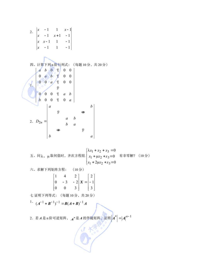 同济大学2019~2020年第一学期《线性代数》试卷专业学号姓名一、单选题(每题3分,共15分)(1)如果四阶行列式中每一列的四个元素之和等于0,则行列式的值为A.1B.4C.OD.不能确定-x1-2x2-2x3(2)若三阶行列式D=1,则阶行列式”-2y2-2y3212-21-2=2-221()A.-8B.8C.-4D.4③)若矩阵A=,)B=,)C=人,)则下列运算中()无意义·A.ABC B.BCA C.A+BC D.+BC(4)设A为阶方阵,且A=A,则()成立(A)A=0:(B)若A不可逆则A=0(C)A=E(D)若A可逆则A=E(⑤)n阶方阵A经过若干次初等变换后化为矩阵B,则A.必有A片B|:B.必有A|AB:C.若A=0则必有B=0:D.若A>0则必有B>0二填空题(每题3分,共15分)23则积C=AB的元素c2=(3)已知四阶行列式D中第二行上元素分别是一1,O,2,4,第三行上的元素的余子式分别为1,2,1,4,则4=则二阶方阵A的逆矩阵A1=同已知线性方程组代=8,其中系数矩阵A=2?,若X。日为它的解。则常数项矩阵B三、利用行列式的性质计算下列各行列式:(每题10分,共20分)2-51-37-145-9274-612