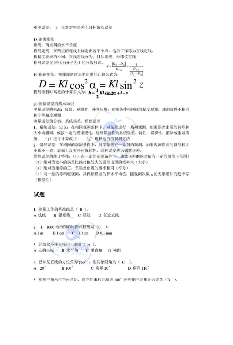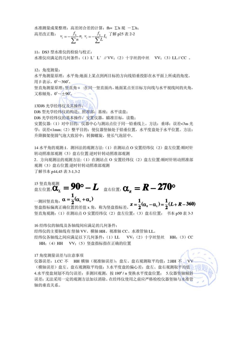 1测量学的概念:测量学是研究地球的形状和大小以及确定地面点位的科学。分为测定和测设两部分内容。2地球的物理表面一水准面:地球的数学表面一旋转椭球体面重力的方向线称为铅垂线一基准线:水准面:任何一点都与重力方向相垂直的面。或水在静止时的表面。水平面:与水准面相切的平面。大地水准面:与平均海水面相吻合并向大陆岛屿延伸而形成的封闭曲面称为大地水准面一一测量基准面:所包围的形体称为大地体达地球椭球体:椭圆绕其短轴旋转而成的旋转椭球体,又称地球椭球体。3测量坐标系与数学坐标系的区别:坐标轴不同,象限旋转顺序不同4地面点的高程:(1)绝对高程:地面点到大地水准面的铅垂距离,称为该点的绝对高程,简称高程,用H表示。(2)相对高程:地面点到假定水准面的铅垂距离,称为该点的相对高程或假定高程。(3)高差:地面两点间的高程之差,称为高差,用表示。高差有方向和正负。5测量工作的原则:1、在布局上遵循“由整体到局部”的原则,在精度遵循“由高级到低级”的原则,在程序上遵循“先控制后碎部”的原则:2、在测量过程中,遵循“随时检查,杜绝错误”的原则:测量的基本工作:1测距离、角度、高差是测量的基本工作:2距离、水平角、高差称测量三要素:3观测、计算、绘图是测量工作的基本技能6水准测量:高差等于后视读数减去前视读数。计算未知点高程:1.高差法:2.视线高法7DS3微倾式水准仪的构造:望远镜:水准器:基座视准轴CC:十字丝交点与物镜光心的连线水准管轴LL:过零点与内表面相切的直线CC∥LL构造满足的主要条件圆水准器轴L'L':过零点的球面法线:L’L'∥VV水准仪的操作:1、安置仪器2、粗略整平3、瞄准水准尺4、精确整平5、读数8视差:眼睛在目镜端上下移动,有时可看见十字丝的中丝与水准尺影像之间相对移动的现象。产生的原因:水准尺的尺像与十字丝平面不重合。消除的方法:仔细地转动物镜对光螺旋,直至尺像与十字丝平面重合9水准点:用水准测量的方法测定的高程控制点,称为水准点。水准路线:在水准点间进行水准测量所经过的路线,称为水准路线。相邻两水准点间的路线称为测段。在一般的工程测量中,水准路线布设形式主要有以下三种形式:1.附合水准路线2。闭合水准路线3.支水准路线10普通水准测量方法:,会填p23表2-2