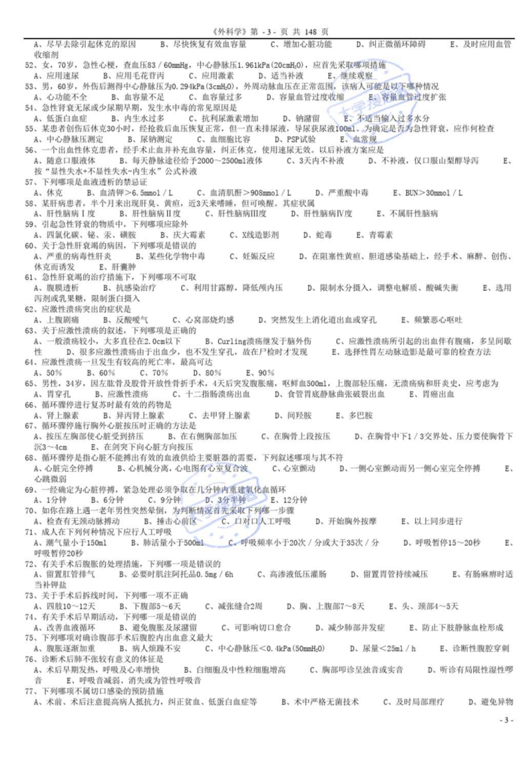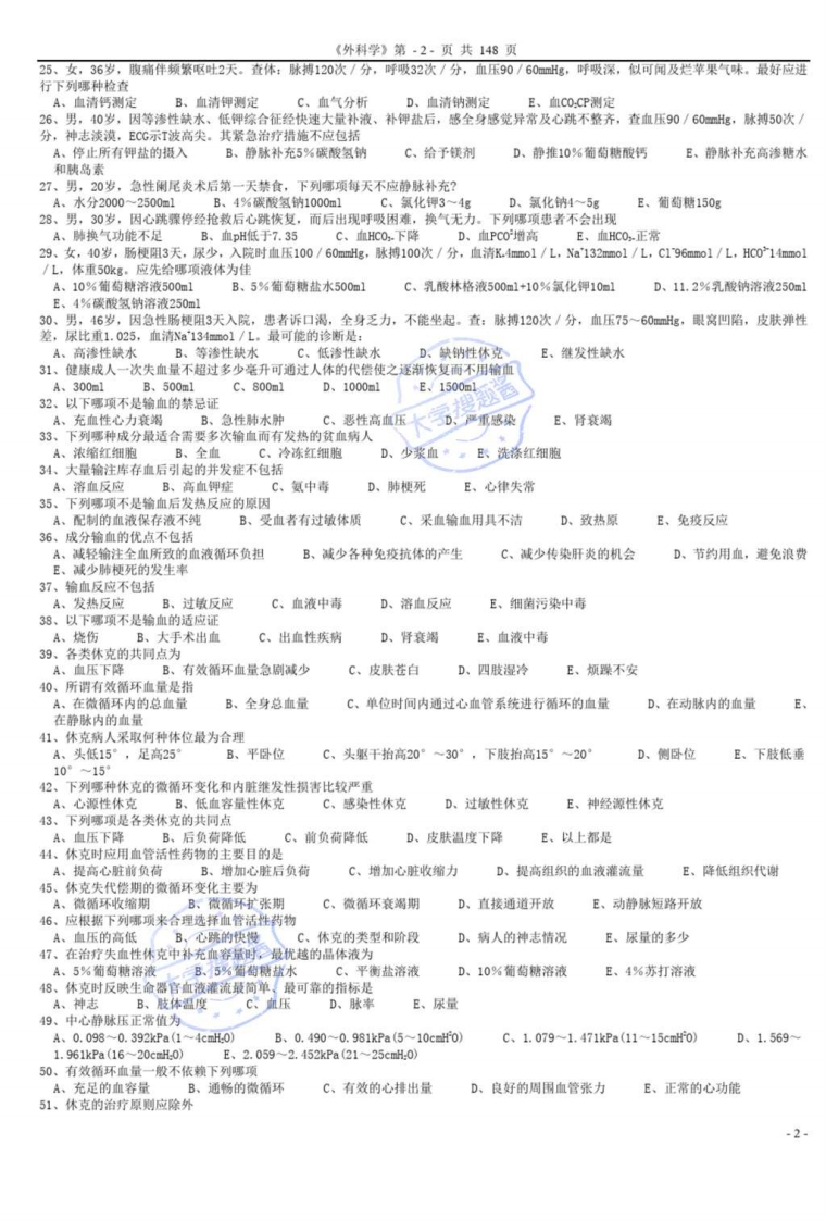 《外科学》第-1·页共148页一、题下选项可能多个正确,只能选择其中最佳的一项1、低钾血症是A、临床上常表现为精神亢奋,肢体抽搐B、严重时可发生室性心动过速,甚至室颤C、心电图表现为T波高尖,星帐篷样D、常伴有代谢性酸中毒E、机体总钾量总是减少的2、幽门梗阻所致持续呕吐可造成A、低氯高钾性碱中毒B、缺钾性酸中毒C、低氯低钾性酸中毒D、低氯高钠性碱中毒E、低氯低钾性碱中毒3、诊断代谢性酸中毒的主要依据是A、呼吸浅而慢,血浆二氧化碳结合力下降B、呼吸深而快,血浆二氧化碳结合力上升C、呼吸深而快,有酮味,血浆碳酸氢根值下降D、呼吸闲难,血浆碳酸氢根值上升E、呼吸慢,心律慢,血压高,神志不清4、低渗性缺水,血清尚未出现缺钠之前,尿中氯化钠A、正常B、略高C、时高时低D、减少或缺乏E、由低升高5、代谢性酸中毒可引起血钾增高,但在纠正酸中毒后需及时补钾,理由是A、钾从细胞内转移至细胞外,部分从尿中排除B、酸中毒纠正后,细胞内、:外液K交换停止,而尿排钾仍在继续C、钾从细胞外进入细胞内,钾从尿中排出,细胞外钾被稀释D、酸中毒时体内总钾实际上并不增高,而是减少E、为了防止发生代谢性碱中毒6、容易伴发代谢性酸中毒的病情是A、长期静脉滴注葡萄糖B、食管梗阻C、幽门梗阻D、急性阑尾炎E、弥没性腹膜炎7、高渗性脱水的常见病因是A、急性胃肠炎B、感染性休克C、大面积烧伤D、尿崩症E、甲状腺功能亢进8、等渗性脱水的常见病因是A、急性肠梗阻B、感染性休克C、肺炎高热D、慢性十二指肠缕E、挤压综合征9、关于高渗性脱水,下列错误的是A、缺水多于缺钠B、血清钠155mmo1/LC、缺水量超过体重的6%,可发生谵安、昏迷、休克D、缺水量大于体重的4%,患者烦躁、尿量显著减少E、缺水量为体重的2%时,尿少、尿比重偏低10、下列防治低钾血症的措施,错误的是A、禁食的成年患者一般应每日从静脉内补充3g氯化钾B、补钾常用10%氯化钾加入500▣1溶液中静滴C、用排钾类利尿剂的患者,宜适当补钾D、对代谢性碱中毒的患者应检查血清钾E、输注10%萄萄糖溶液时常规加入胰岛素11、低钾血症病人,经补充钾治疗后,病情仍无改善时,应考虑有A、低钠血症B、低镁血症C、高钙血症D、代谢性酸中毒E、低氯血症12、等渗性脱水多发生于A,水分摄入不足B、水分丧失过多C、渗透性利尿D、消化液急性丧失E、消化液长期慢性丧失13、关于机体水钠代谢失调,下列叙述正确的是A、脱水就是指水分的减少B、低渗性脱水时尿钠可以消失C、高参性脱水的治疗应以补盐为主D、各种原因引起的脱水都使体重减轻E、重度等渗性脱水需大量补液时以生理盐水为宜14、下列叙述正确的是A、高渗性脱水常有细胞内水肿B、等参性脱水主要是细胞脱水C、低参性脱水易发生休克D、重度低渗性脱水口渴极明显E、重度高参性脱水易出现神经系统症状15、关于水,电解质和酸碱平衡失调的治疗,下列正确的是A、5%碳酸氢钠是临床上最常用的等渗碱性溶液B、10%葡萄糖酸钙不能直接静脉注射C、即使是重度脱水,也不必补充脱体溶液D、低钾血症难以纠正时,应考虑在补钾的基础上补镁E、纠正呼吸性酸中毒的主要措施是补充THAM16、常用的平衡盐溶液为A、5%葡萄糖氯化钠溶液B、复方氯化钠溶液C、乳酸钠林格液D、1.25%碳酸氢钠1/3和等渗盐水2/3E、5%威碳酸氢钠1/3和等渗盐水2/317、反复呕吐可导致电解质素乱,损失最多的是A、aB、C1C、HD、XE、Ca18、下列最易致低钾血症的是A、大量出汗B、严重肠痿C、大面积烧伤D、感染性休克E、大量输血19、等渗性缺水病人,大量输入生理盐水治疗可导致A、高钾血症B、低钾血症C、低氯血症D、商钙血建少5·高氯题酱20、关于静脉补液,下列哪项是错误的A、低渗性缺水应补等渗或高渗盐水B、等渗性缺水最好用平衡盐溶液C、高渗性缺水最好补等渗盐水D、等渗性缺水用等渗盐水补充可致高氯血定E、估计缺水量后,先补计算量之12,加上当天生理需要量和继续丢失量21、用5%碳酸氢钠溶液处理高钾血症不是因为A、增加血容量以稀释血钾浓度B、促使K移入细胞内C、碱化尿时区从尿中排出增彩D、Na'可对抗K对心肌毒性作用E、有效而长期降低血钾浓度22、下列哪项不是等渗性缺水酸中毒纠正后易出现低钾血症的原因?A、尿量增多,肾排钾增多B、血清K大量移入组织间液C、由于细胞外液增多,血K浓度稀释D、补充碱液使大量K转移入细胞内E、细胞内外移动态停止23、一肠梗阻术后患者,血清Na130mmo1/L,K3mmo1/L,C198mmo1/L,B8mo】/L,应考虑与下列爆项因素有关A、补充了大量等渗盐水B、水分补充不足C、补充了大量等渗糖水D、补充了足量的钾盐E、肾功能不全24、男,26岁,十二指肠残端痿20天,日前进食少,全身乏力,直立时晕倒,血清X3mo1/L,Na125=一o1/L.其水盐代谢失调应为A、低钾血症,高渗性缺水B、高钾血症,重度低渗性缺水C、低钾血症,等海性缺水D、低钾血症,中度低渗性缺水E、低渗性缺水-1-