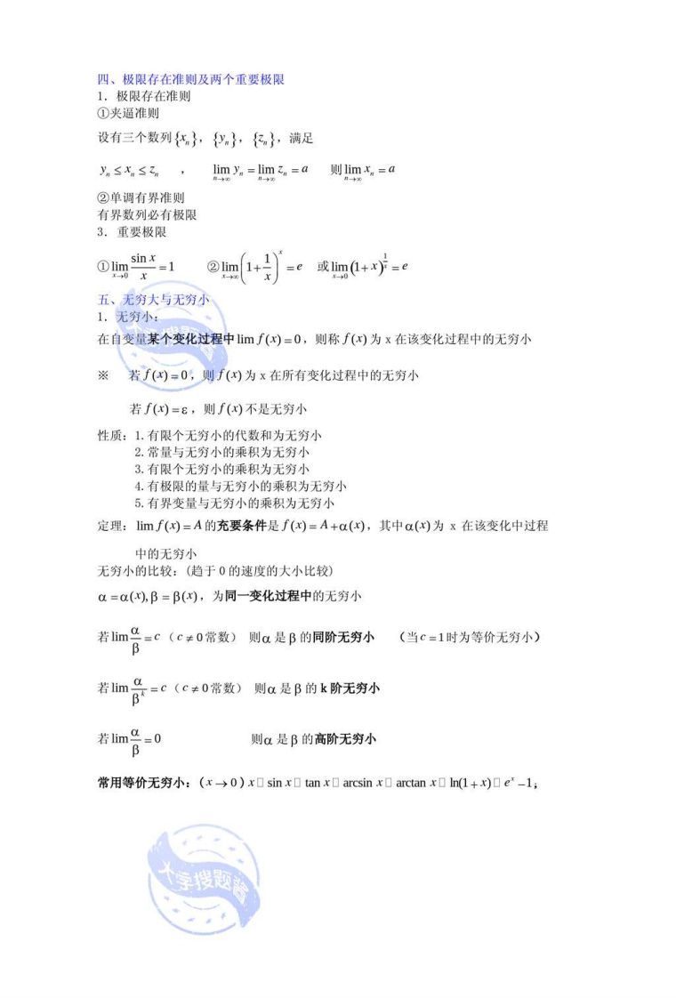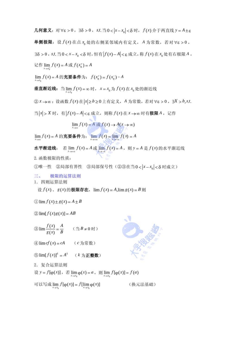 微积分第一章、极限与连续一、数列的极限1.数列大学搜题酱定义:按着正整数的顺序排列起来的无穷多个数,,x,…叫数列,记作仁},并吧每个数叫做数列的项,第n个数叫做数列的第n项或通项界的概念:一个数列},若M>0,s以.对neN,都有sM,则称代}是有界的:若不论M有多大,总meN”,s.r>M,则称x}是无界的若a≤x。≤b,则a称为x的下界,b称为x的上界代}有界的充要条件:{仁}既有上界,又有下界2.数列极限的概念定义:设{x}为一个数列,a为一个常数,若对Ve>0,总3N,51.当n>N时,有x-a<8则称a是数列xn}的极限,记作limx。=a或x。→a(noo)数列有极限时,称该数列为收敛的,否则为发散的几何意义:从第N+1项开始,化,}的所有项全部落在点a的e邻域a-E,a+e)聘题3.数列极限的性质①唯一性②收敛必有界③保号性:极限大小关系三数列大小关系(n>N时)二、函数的极限1.定义:两种情形①x→x。:设f(x)在点x处的某去心邻域内有定义,A为常数,若对ε>0,8>0,51.当0