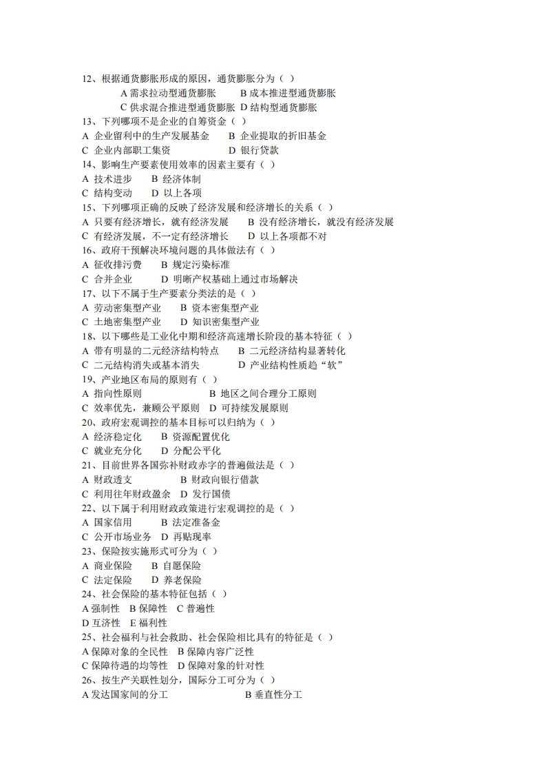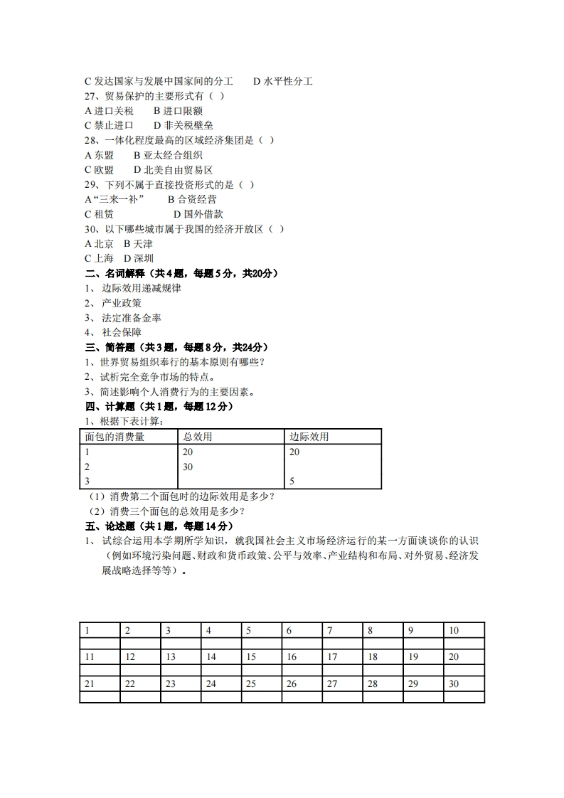 武汉大学《宏观经济学》2018-2019学年第一学期期末试卷1、选择题(共30题,每题1分,至少有一个答案是正确的,多选或少选均不得分共30分)请将所选答案填入答题纸相应的表格中1、从长期来看,下列成本中哪一项成本是不存在的()A可变成本B平均成本C机会成本D固定成本2、己知产量为19单位时,总成本为195元,产量增加到20单位时,平均成本为10元,由此可知边际成本为()A5元B10元C15元D20元3、企业的规模报酬变化可以分为以下三种情况()A规模报酬递增B规模报酬不变C规模报酬递减D规模报酬为零4、某厂商每年从企业的总收入中取出一部分作为自己所提供生产要素的报酬,这部分资金被视为()A.固定成本B.隐性成本C.会计成本D.生产成本5、如果消费者预期其希望购买的商品价格会上涨,他对该商品当前需求可能会()A.减少B.增加C.不变D.上述三种情况都可能6、如果其他各种条件均保持不变,当商品X的互补品Y的价格上升时,对商品X的需求(A上升B下降C不变D升降不确定7、如果其他各种条件均保特不变,当商品X的替代品Y的价格上升时,对商品X的需求(A上升B下降C不变D升降不确定8、一个行业有较多的厂商,各个厂商的产品存在差异,进出市场较容易这样的市场结构被称为()A完全竞争B完全垄断C垄新竞争D寡头竞争9、寡头垄断市场的特征是()A厂商数量很少只有几个,厂商是价格的寻求者B厂商数目很少只有几个,厂商是价格的影响者C产品同质或有差异D进出行业较难10、边际消费倾向与边际储蓄倾向之和()A大于1B小于1C等于1D小于零11、可以看做温和的通货膨胀的情况是()A通货膨胀率以每年10%的速度增长B通货膨胀率以每年1%的速度增长C通货膨胀率一直保持在3%~6%水平D通货膨胀率在100%以上