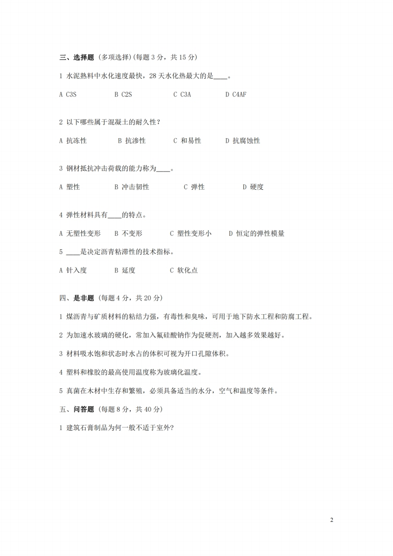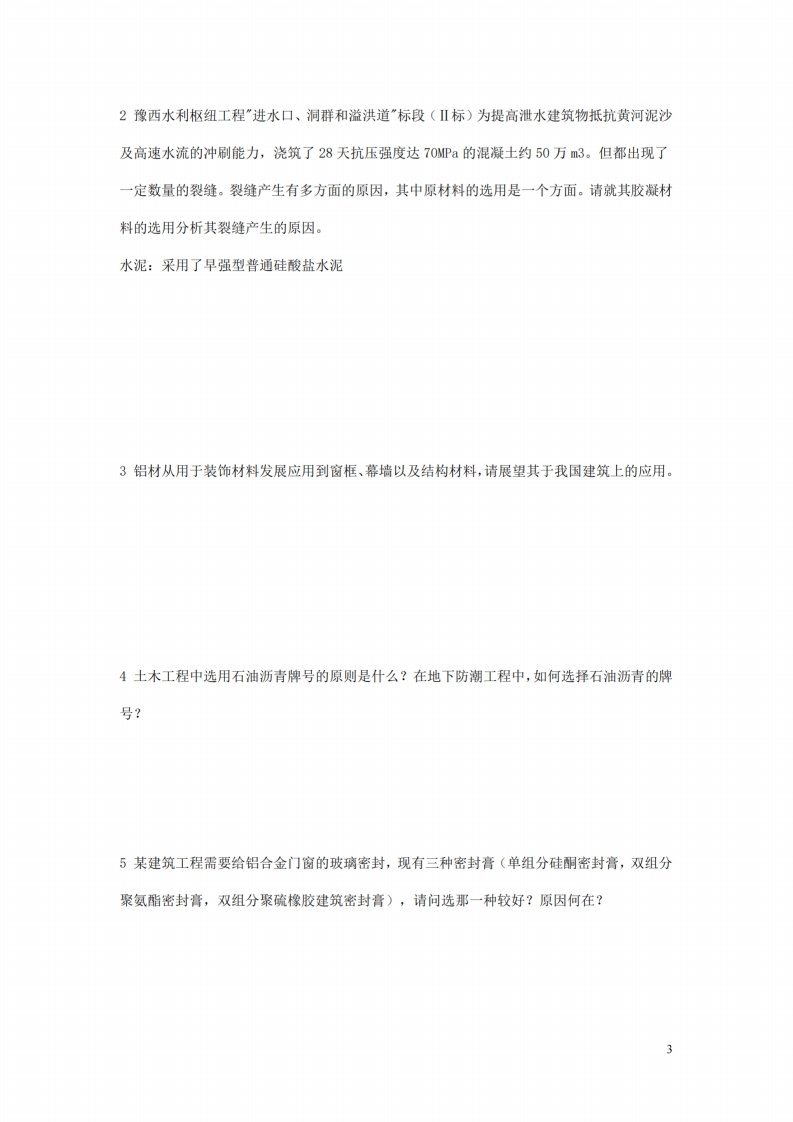 武汉理工大学考试试卷(A卷)2020-2021学年第二学期工程材抖课程闭卷时间120分钟,48学时,3学分,总分100分,占总评成绩6①%姓名:班级:学号:题号二三四五六七九合计任课满分100教师得分(请将答案写在本卷后附的答题纸上,考试终止时将本卷和答题纸一并上交)一、名词解释(每题2分,共6分)》1气硬性胶凝材料2木材的纤维饱和点3碱骨料反应二、填空题(每题3分,共15分)》1是木材物理学性质发生变化的转折点。纤维饱和点。2胶粘剂的基本组成材料由粘料,固化剂,填料和稀释剂等。粘料,固化剂,填料,稀释剂3针入度是规定温度条件下,以规定质量的标准针,在规定时间内贯入试样的深度,以表示1度。4岩石由于形成条件不同,可分为一、一和三大类。5普通混凝土中起骨架作用。
