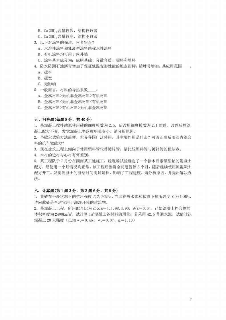 武汉理工大学考试试卷(A卷)2021-2022学年第二学期工程材料课程」闭卷时间120分钟,48学时,3学分,总分100分,占总评成绩60%姓名:班级:学号:题号二三四五六七八九合计任课满分100教师得分(请将答案写在本卷后附的答题纸上,考试终止时将本卷和答题纸一并上交)一、名词解释(每题3分,共6分)1.沥青的针入度2,气硬性胶凝材料二、填空题(每题3分,共15分)1.脆性材料适宜承受荷载,而不宜承受荷载。2.建筑石膏的水化过程是石膏转变为二水石膏过程。3.钢材的ō02表示一。4.建筑砂浆的保水性用来表示。5.沥青的牌号越高,则沥青的塑性越一。三、是非判断题(每题3分,共15分)1.蒸压加气混凝土砌块具有轻质、保温隔热及抗渗性好等优点。2.蒸压加气混凝土砌块多孔,故水易渗入。3.建筑钢材的含碳量增大,珠光体增加,铁素体减少,强度、塑性和韧性均提高。4.常用的安全玻璃有:钢化玻璃和夹层玻璃等。5.砂浆的强度都与初始水灰比有重要关系。四、选择题(每题3分,共15分)1.严寒地区受动荷载作用的焊接结构钢选用牌号钢材。A、QasA·FB、QasBC、Qs2.粉煤灰水泥抗腐蚀性能优于硅酸盐水泥是因其水泥石中。A、Ca(OH),含量较高,结构较致密1