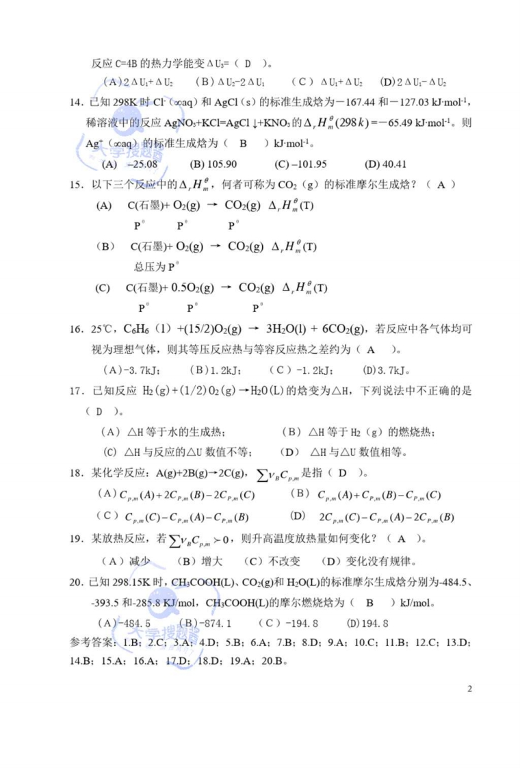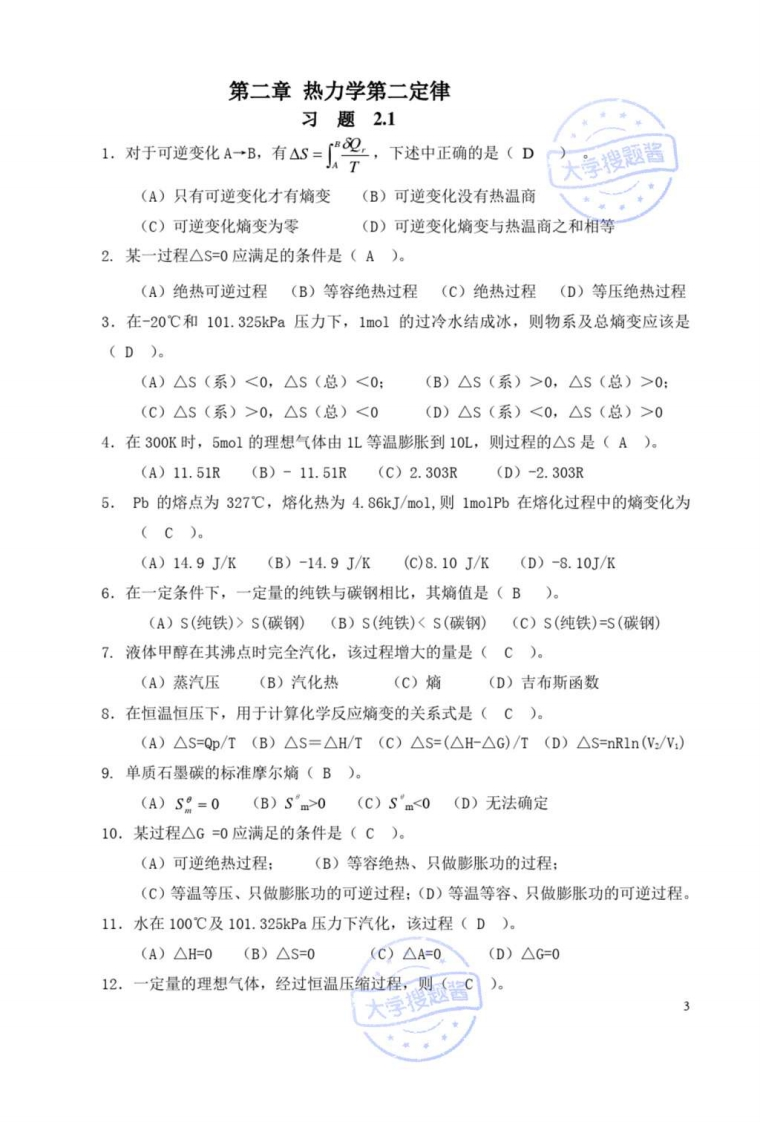 第一章热力学第一定律练习1.11.下面哪一组中各热力学性质均为强度性质?(B(A)U、H、P、:(B)Vm、C.、T(C)P、Vm、S(D)P、G、Vm(摩尔体积)2.封闭系经过任意循环过程,则有(C)。(A)W=0:(B)Q0:(C)W+Q0:D)均不证确酱3,理想气体向真空膨胀过程,则有(A)。(A)W=0,△T=0(B)W<0,△T>0(C)W>0,△T<0(D)W=0,△T<04.对于理想气体,下式中不正确的是(D)。(A)0-0(®)(,-0:c=0:(D)H=05.1mo1理想气体,从体积V:经过等温膨胀至V,该过程(B)。(A)△U>0,△H>=0:(B)△U=0,△H=0:(C)△U<0,△H<0:(D)均不正确。6.水在0℃、101.325kPa压力下结冰过程中(A)。(A)△P=0,△T=0:(B)△U=0,△H=0:(C)△U=0,△T=0:(D)均不正确。7.1摩尔水在100℃、101.325kPa压力下蒸发为同温同压的水蒸气,该过程的体积功为(B).(A)373.15R:(B)-373.15R:(C)0:(D)均不正确。8.Qp=△H的适用条件是(D).(A)可逆过程:(B)理想气体:(C)等压化学变化:(D)等压只作膨胀功。9.1mo1单原子理想气体,在300K时绝热压缩到500K,焓变△H约为(A)。(A)4157J(B)596J(C)1255JD)994J10.在绝热钢瓶中,发生一个分子数增加的放热反应,以钢瓶为体系则(C)。(A)Q>0.W>0.△U>0(B)Q=0,W=0.△U<0(C)Q-0,W=0,△U=0(D)Q<0,W>0,△U<011.下面一些宏观过程可以看作可逆过程的是(B)。(A)磨擦生热(B)0℃冰的融化(C)电流通过金属发热(D)燃烧一根木柴。12.关系式(PV)'=常数只适用于(C)。(A)理想气体可逆过程:(B)理想气体绝热过程:(C)理想气体绝热可逆过程:D)任何气体的绝热过程搜题置13.在恒温、恒容条件下,反应A=2B的热力学能变为△U,反应2A=C的为△U,则