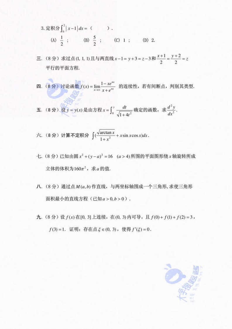 西安电子科技大学2020-2021高数上期末考试题考试120分钟题号四五六七八九总分分数1.考试形式:闭卷:2.本试卷共九大题,满分100分.班级学号姓名任课教师一.填空题(每小题4分,共32分)1.limk(k+2.设y(x)=(e-1)(e2a-2)…(e-n),则y'(0)=3.函数f(x)=xer的单调减少区间是4.设函数fx)连续,且∫。f)=x,则f()=5.定积分」(x+sin)d的值=6曲线y=∫and0sx≤孕的弧长s=7.设a=(2,1,2),b=(4,-1,10),c=b-1a且a1c,则元=8.设曲线y=x2与y=cx(c>0)所围成的面积为名,则c=二.单项选择题(每小题4分,共12分)x2sin-1.在x=0处,函数f(x)是0x=0(A)极限不存在:(B)极限存在但不连续;(C)连续但不可导:(D)可导2.若函数f(x)在x=x处取得极值,则).长(A)f'(x)=0:(B)f"(x)<0:(C)f'(x)=0或f'(x)不存在:(D)f'(x)不存在.