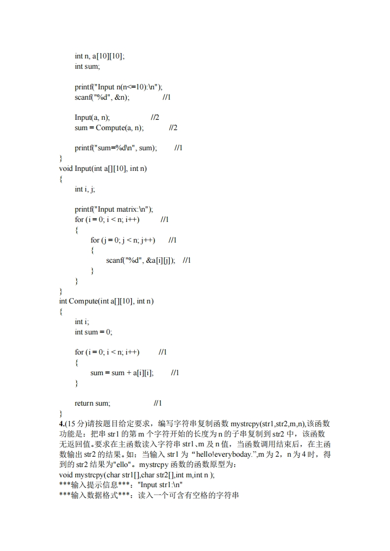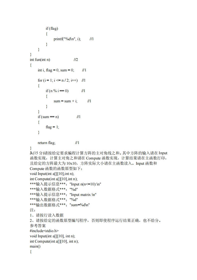 普通编程题(60分)1.(15分)编程计算:3+33+333+.+33.3(n个3)的值,n值由键盘输入。**输入提示信息**:"Input n:n"**输入数据格式**:"%d"**输出数据格式**:"sum=%ldn"注:不允许使用goto语句参考答案#includemain(){int 1,n;long term,sum =0;/1printf"Input n:n")方scanf("%d",&n);/1for (i=1,term=3;i<=n;i++)//4{sum sum term;1/2term term 10+3;12printf("sum=%ldn",sum);1}2.(15分)请按给定要求编写程序,编程打印100-10000之间的所有完数。所谓完数是指一个数的所有因子(除其自身)之和恰好等于其自身。如6就是一个完数因为6=1+2+3。判断一个数是否是完数请按给定的函数原型编程实现,若是完数函数返回值为1,否则返回值为0。函数原型如下:int fun(int n);**输入提示信息**:无**输入数据格式**:无**输出数据格式**:"%d小n"注:不按给定的函数原型编写程序,即使程序运行结果正确也不给分。参考答案#includeint fun(int n);main()int i,flag;for(i=100:i<=10000:i++)/1{flag fun(i);1/2