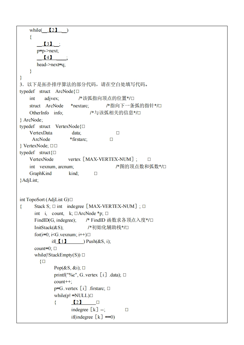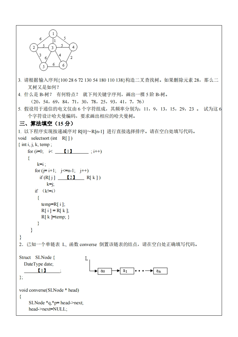 西安交通大学《数据结构与算法》2022-2023学年第一学期期末试卷一、单选题:(每小题2分,10小题,共20分)1、若进栈序列为1,2,3,4,5,6,且进栈和出栈可以穿插进行,则可能出现的出栈序列为()A.3,2,6,1,4,5B.3,4,2,1,6,5C.1,2,5,3,4,6D.5,6,4,2,3,12、若用邻接矩阵表示一个有向图,则其中每一列包含的"1"的个数为()A.图中每个顶点的入度B.图中每个顶点的出度C.图中弧的条数D.图中连通分量的数目3、下列二叉树中,()可用于实现符号的不等长高效编码。A.最优二叉树B.B-树C.平衡二叉树D.二叉排序树4、在对个关键字进行直接选择排序的过程中,每一趟都要从无序区选出最小关键字元素,则在进行第趟排序之前,无序区中关键字元素的个数为()A.iB.i+1C.n-iD.n-i+l5、若有序表的关键字序列为(b,c,d,e,£,g,q,r,s,t),则在二分查找关键字b的过程中,先后进行比较的关键字依次为()A.fc,bB.f,d,bC.g.c,bD.g,d,b6、设有5000个待排序的记录关键字,如果需要用最快的方法选出其中最小的10个记录关键字,则用下列()方法可以达到此目的。A.快速排序B.堆排序C.归并排序D.插入排序7、排序算法中,第一趟排序后,任一元素都不能确定其最终位置的算法是()A.选择排序B.快速排序C.冒泡排序D.插入排序8、有n个结点的有向完全图的弧数是()A.n2B.2nC.n(n-1)D.2n(n+1)9、判断一个有向图是否存在回路,除了可以利用拓扑排序方法外,还可以利用()A.求关键路径的方法B.求最短路径的Dijkstra方法C.深度优先遍历算法D.广度优先遍历算法10、在一个单链表中,若q结点是p结点的前驱结点,若在q与p之间插入结点s,则执行(A.s→link=p→link,p→link=s,B.p→link=s,s→link=qC.p→link=s→link,s→link=p;D.q→link=s,s→link=p,二、简答题(每题5分,5题,共25分)1.一颗二叉树的前序遍历的结果是1,2,3,4,5,6,中序遍历的结果是3,2,4,6,5,1。请画出这颗二叉树。2.请用Pim算法画出右图最小生成树的生成过程。