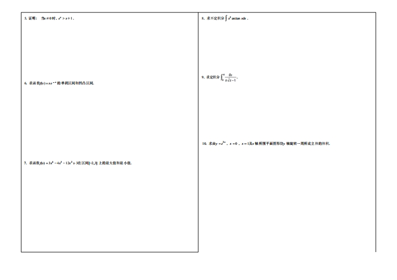 西北大学2016一2017学年第一学期微积分期末试题B题号二三总分4.已知业=/如x+a8到+C,则)分数三.若在(-,烟内有连接的二龄导函数.且网=l,4=3,=5,则2业答题说明:考流前。清把考生信息裤写在相应位夏。波题答常全邮珠写在本流春内,其中选样题等三、计算题与证训题(每题7分,共刀分】↓求解:1g-nr案装在题后括号内。裤空题答常裤在题后横线处,计桌题与江明题答常裤在题下的空白处,a0+一、单项选择题(每题3分,共15分)L函数,=之之是()A俱函数品。奇函数C.非奇非得函数2.设风对■x4。则=是风对的《)"d-'2求报鼎:九连续点丑网点C.可胡断点3.函数=道3-在区何即3上持足R业定理的=()A0时C.-3D既奇又得函微24.自找到-红-2+2()D第二数薄点九有极值点:▣5,包无祸点1.求箱线产=上:上时空于”处的法线方配五.低2)是得点,包无版值点下■1+血C.有一个板值点:=5,还有一个钢点5习号D既无极值点也无祸点三设爪)有蓬续话数。则下列正确的是()A.Kxkd-Kx)B.Jfe"元c.nae-kscD.-Ks)二、填空增(每题3分,共15分】4.若y风)是由方程y+e”-y+5=0确定的总函数,求女.如之则风x]工如果稀斯到“在点“1处连接。影1+2,x=L3。曲线,=2-4的新近线方暖3+玉41