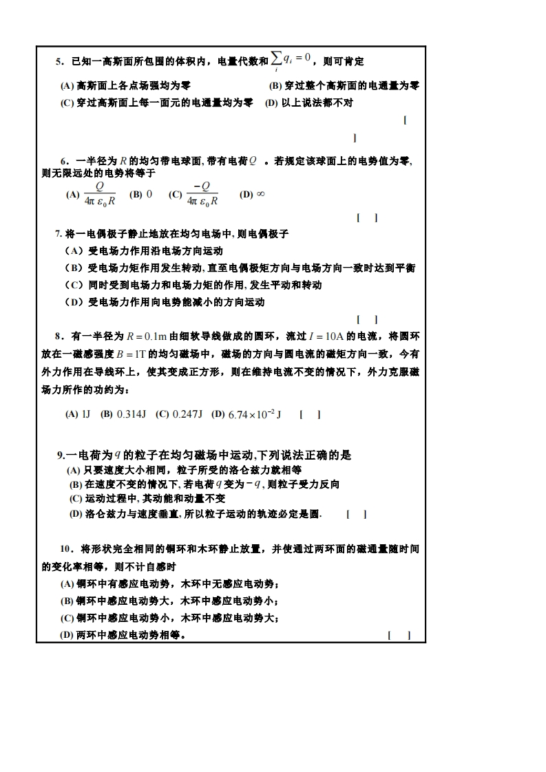 试题选择题(每题3分,共30分)1.质量为0.125kg的质点受到合力F=iN)(t的单位为s)的作用,当t=0时,该质点以i=2j(s)的速度通过坐标原点,该质点的运动学方程是:(2r27+2j(B)47+2面+201(C)(D)+2.质量为m=0.5kg的质点,在X0Y平面内运动,其运动方程为x=5t,y=0.52,(SI制),在1=2s到1=4s这段时间内外力对质点所作的功为(A)1.5J(B)3J(C4.5J(D)-1.5JCI3.光滑水平面上有一质量为M的大炮,炮筒与水平方向成Q角时,射出质量为m的炮弹,炮弹相对于炮身的速率为V,则大炮的反冲速率为U(A)-cosa(B)M+mmy,(1-sina)M+mMv,(C©cosaI I(M+m)2mMv,(1-sina)(D)(M+m)4,对质点或质点系,下述说法哪些是正确的(A)动量变化时,动能必变化(B)动能变化时,动量必变化(C机械能守恒时,动量必守恒(①)动量守恒时,机械能不一定守恒共6页第1页