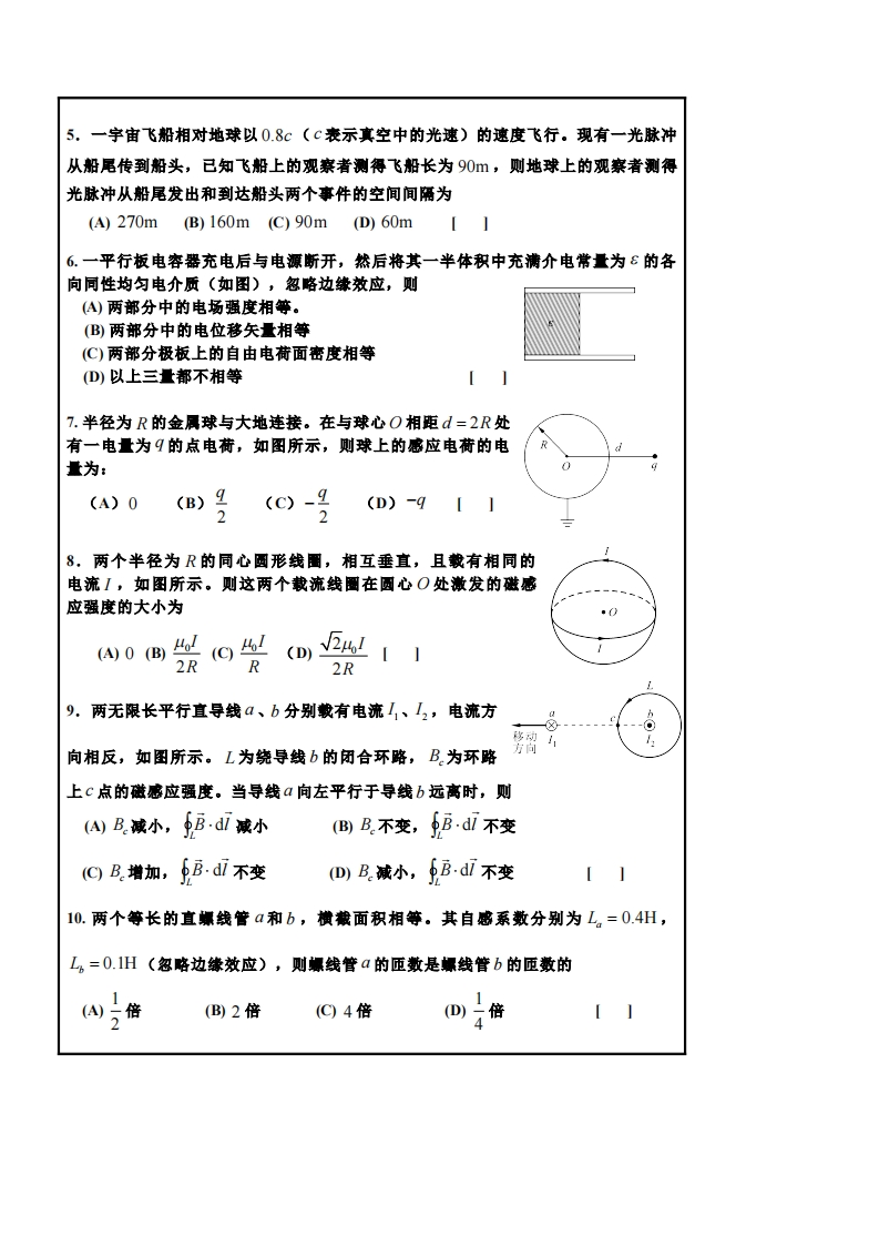试题成绩一选择题(每题3分,共30分)1.一质点在力子=fc了作用下运动,如果在x=0处质点的速度为零,则质点可能获得的最大动能为ω天四兰(C0(Dke*6【12.一均匀细杆原来静止放在光滑的水平面上,现在其一端给予一垂直于杆身的水平方向的打击,此后杆的运动情况是:(A)杆沿力的方向平动。(B)杆绕其未受打击的端点转动。(C杆的质心沿打击力的方向运动,杆又绕质心转动。(D)杆的质心不动,而杆绕质心转动。3。轻质绳子的一端系一质量为m的物体,另一端穿过水平桌面上的小孔O,用手拉着,物体以角速度⊙绕O转动,如图所示。若绳子与桌面之间、物体与桌面之间的摩擦均可忽略,则当手用力F向下拉绳子时,下列说法中正确的是A)物体的动量守恒(B)物体的角动量守恒(C)力F对物体做功为零(①)物体与地球组成的系统机械能守恒【4,令电子的速率为V,则电子的动能E,对于比值U/c的图线可用下列图中哪一个图表示?(c表示真空中的光速)E1.0/c1.0c1.0d1.0c[A][B][C][D]共6页第1页