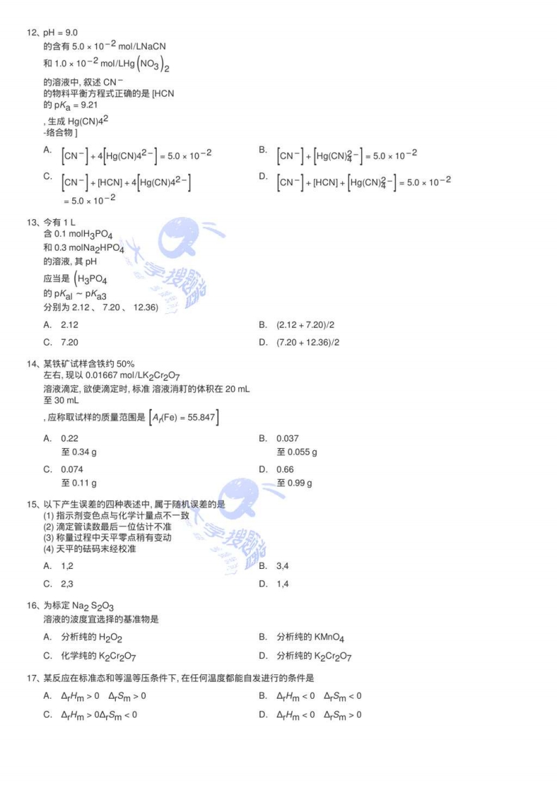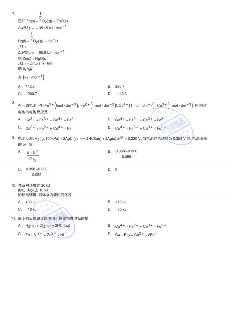 西南石油大学2020-2021学年第一学期期未试A卷(无机及分析化学)单项选择题1、OH的共轭酸是A.H+B.H20C.H3O+D.022、同温同浓度的下列水溶液中,使溶液沸点升高最多的溶质是A.CuSO4C.A2(s0430KAI(SO4)23、下列反应中释放能量最大的是A.CH4)+202(g)→C02(g)+2H20(gB.CH4(g)+202(g)→C02(g)+2H2Og)C.CH4(g)+202(g)→C02(g)+2H200D0CHA()2()C)2H0)4、EDTA相当于一个六元酸,可与金属离子形成整合物,所形成的多个环为A.五元环B.六元环C.四元环D.不成环5、关于原子结构的叙述中,其中不正确叙述是(1)所有原子核均由中子和质子构成(2)原子处于基态时,次外层电子不一定是8个(3)稀有气体元素,其基态原子最外层有8个电子(4)最外层电子数为2的原子一定是金属原子A.(1)2(4)B.(1)(2)3)C.(2)3)D.(1)3)(4)6、0.100mol,kg-1KCl溶液在稍高于-0.372°C时结冰,对这个现录的解释是(水的K=1.86K.kg.mol-1大字搜A.KCIB.离子互吸末完全缔合C.离子互斥D.溶液蒸气压下降