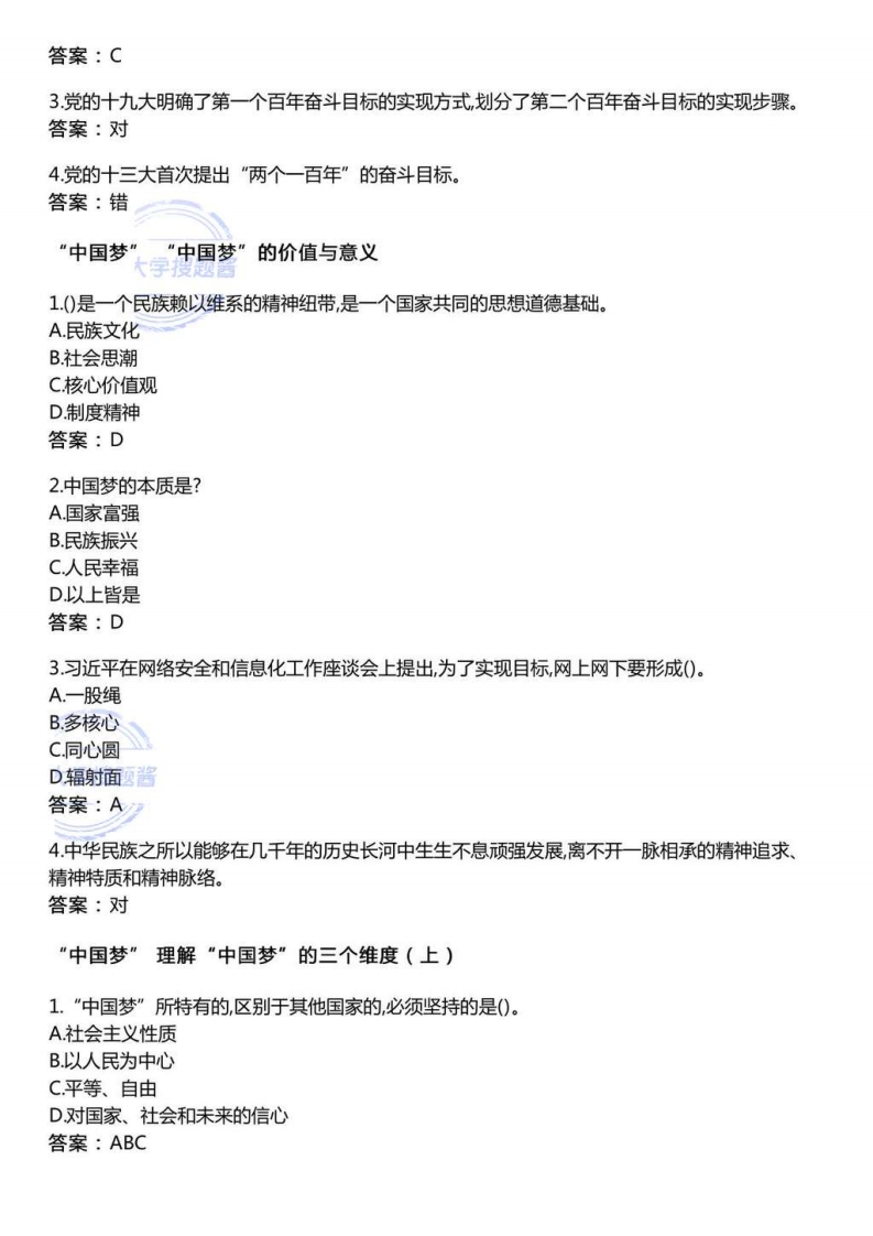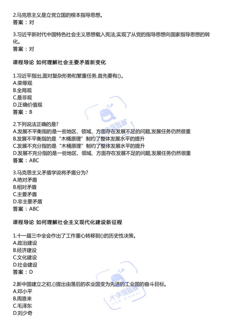习近平新时代中国特色社会主义思想概论(中国政法大学)网课答案课程导论如何理解新时代1新时代我国的目标任务是在全面建成小康社会的基础上,分(0步走,到本世纪中叶把我国建成富强民主文明和谐美丽的社会主义现代化强国。A两B三C四D五答案:A大学搜题酱2新时代我国社会主要矛盾是(0。A人民日益增长的物质文化需要同落后的社会生产之间的矛盾B.人民日益增长的购买力和社会生产力落后之间的矛盾C人民日益增长的美好生活需要和不平衡不充分的发展之间的矛盾D,人民工资水平低和物价水平高之间的矛盾答案:C3.下列属于以生产关系为标准进行划分的时代有?A石器时代B原始时代C奴隶时代D电气时代答案:BC4我国新的发展阶段将推动经济转向高速增长阶段。答案:错5新时代是经济社会发展到一定阶段的历史飞跃。答案:对大学搜题省课程导论如何理解新思想1.中国特色社会主义最本质的特征是(0。A坚持以人为本B.人民民主专政C人民当家作主D.中国共产党领导答案:D