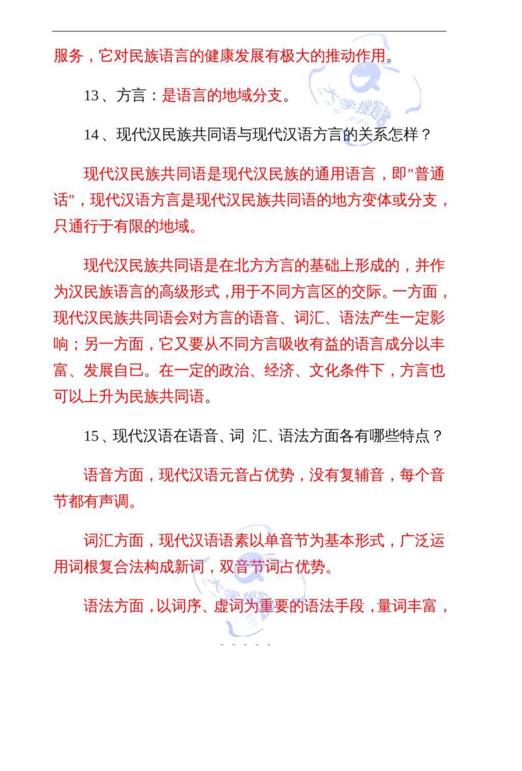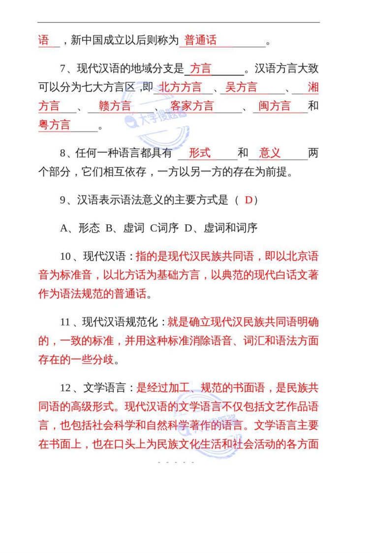 导论1、汉语做为一种语言,具有一切语言共有的性质。即从内部结构上说,它是一种音义结合的符号系统;从外部功能上说,它是人类社会最重要的交际工具和思维工具2、语言符号最重要的特点是任意性和线条性3、“现代汉语”通常有两种解释,狭义的解释指的是现代汉民族共同语,广义的解释还兼指现代汉民族使用的方言,我们这里讲述的是普通话4、现代汉语有口语和书面语两种不同的形式。文学语言是民族共同语的高级形式。5、现代汉语民族共同语又叫普通话,它以北京语音为标准音,以北方话为基础方言,以典范的现代白话文著作为语法规范6、民族共同语是在一种方言的基础上形成的。汉族早在先秦时代就存在着古代民族共同语,在春秋时代,这种共同语被称为雅言,从汉代起被称为通语,明代改称为官话。到了现代,即辛亥革命后又称为国大字搜