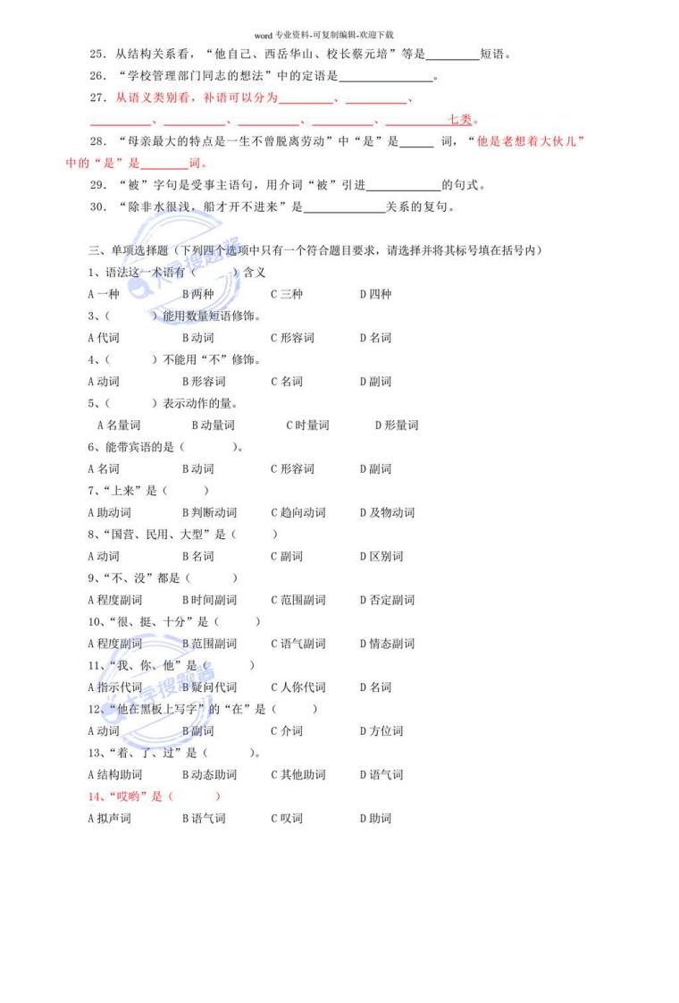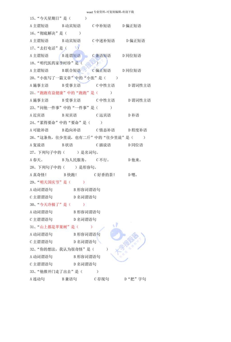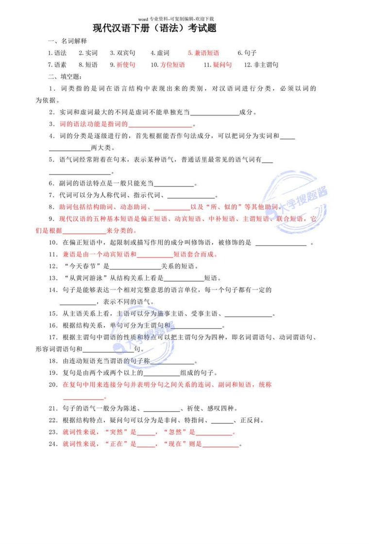 wod专业资料.可复制编辑-欢迎下载现代汉语下册(语法)考试题一、名词解释1.语法2.实词3.双宾句4.虚词5.兼语短语6.句子7.语素8.短语9.祈使句10.方位短语11.疑问句12.非主谓句二、填空题:1,词类指的是词在语言结构中表现出来的类别,对汉语词进行分类,必须以词的为依据。2.实词和虚词最大的不同是虚词不能单独充当成分。3.词的语法功能是指词的4.词的分类是逐级进行的,首先根据能否作句法成分,可以把词分为实词和两大类。5.语气词经常附着在句末,表示某种语气,普通话里最常见的语气词有6.副词的语法特点是一般只能充当7.代词可以分为人称代词、指示代词、8。助词包括结构助词、动态助词、以及“所、似的”等其他助词水学搜题酱》9。现代汉语的五种基本短语是偏正短语、动宾短语、中补短语、主谓短语、联合短语,它们是根据来分类的。10.在偏正短语中,起限制或描写作用的成分叫修饰语,被修饰的是11.兼语是由一个动宾短语和短语套合而成12.“今天春节”是关系的短语。13.“从黄河游泳”从结构关系上看是短语。14.句子是能够表达一个相对完整意思的语言单位,每一个句子都有一定的,表示不同的语气。15.从主语关系上看,主语可以分为施事主语、受事主语、16.根据结构关系,单句可分为主谓句和17.根据主谓句中谓语的性质和特点可以把主谓句分为四种,即名词谓语句、动词谓语句、形容词谓语句和句。18.由连动短语充当谓语的句子称19.复句是由两个或两个以上的组成的句子。20.在复句中用来连接分句并表明分句之间关系的连词、副词和短语,统称21.句子的语气一般分为陈述、祈使、感叹四种。22.根据结构特点,疑问句可以分为是非问、特指问、、正反问。23.就词性来说,“突然”是—,“忽然”是24.就词性来说,“正在”是,“现在”则是