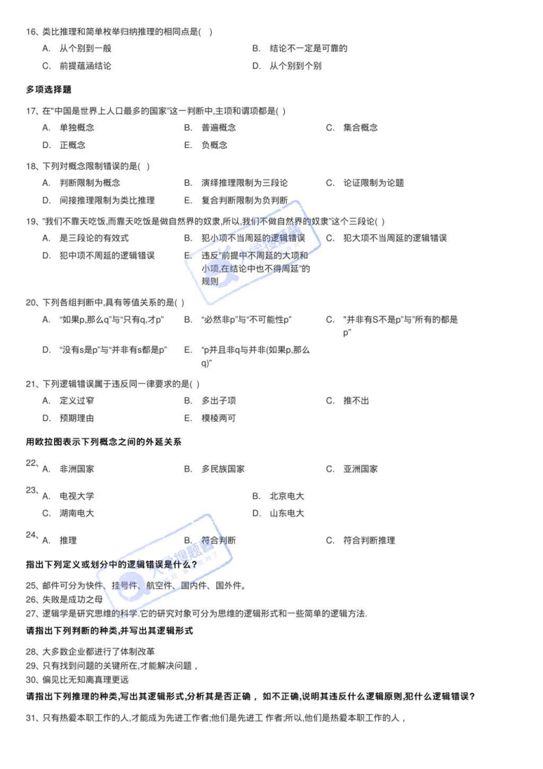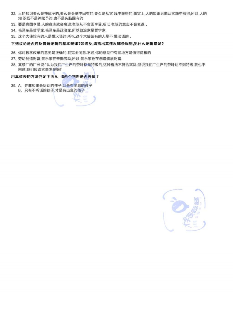 湘潭大学期末试卷试题(逻辑学)填空题1、一各性质判断的谓项不周延,则这个判断的质是:一个性质判断的主项周延,则这个判断的量是2、对SAP判断换质,其结论是对SAP判断换位,其结论是3、根据性质判断对当关系,如果SEP假,则SAF、SIF、SOF大学搜题酱4、违反三段论"中项在前提中必须至少周延一次"的规则,会犯的逻辑错误。5、“并非只有由外国人当经理,才能把企业搞好。"与该负判断等值的判断是6、违反同一律要求所犯的基本逻辑错误是。单项选择题7、概念与语词的关系是()A.所有的语词都是表达概念B.所有的语词都不表达概念C.所有的概念都要通过语词来表达D.有的概念不通过语词来表达8、在"知识分子是国家的宝贵财富"和”大学教师是知识分子"这两个判断中,“知识分子"这个概念()A.都是集合概念B.都是非集合概念C.前者是集合概念,后者是非集合概念D.前者是非集合概念,后者是集合概念9、“圆是平面上的点对一个中心保持相等距离运动所形成的封闭的曲线。"作为定义,属于()A.语词定义B.发生定义C.功用定义D.关系定义10、在性质判断中,决定判断形式的是()A.主项和谓项B.主项和量项C.谓项和联项D.量项和联项11、“某甲是有罪的"与某甲是无罪的这两个性质判断之间是()A.反对关系B.矛盾关系C.差等关系D.下反对关12、普通逻辑学是没有阶级性的,普通逻辑学是科学。所以,所有的科学都是没有阶级性。"这个三段论是()A.有效的推理形式B.犯中项不周延的逻辑错误C.犯大项不当周延的逻辑错误D.犯小项不当周延的逻辑13、己知"当且仅p才q,"pg,"p>q均真,则()A.p真q真B.p假q真C.p真q假《大学搜题酱D.非p真非q14、“并非小王和小李都是电大学生。其等值判断是()A.小王和小李都是电大学生B.小王是三好学生,小李不是电大学生C.如果小王是三好学生则小李就是电大学生D.或者小王不是电大学生,或者小李不是电大学生15、如果既部否定SAP,又不否定SEP,则()A.违反同一律的要求B.违反部矛盾律的要求C.违反排中律的要求D.不违反普遍逻辑基本规律的要求