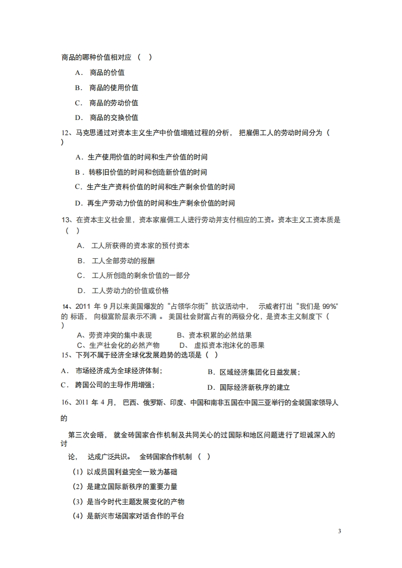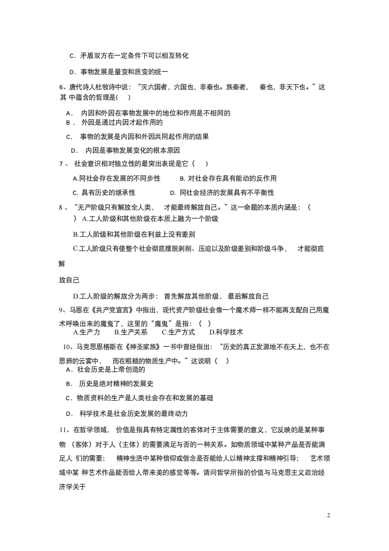 新疆师范大学《马克思主义基本原理》2019-2020学年第一学期期末试卷一、单项选择题(20题,每题1分,共20分)1、人类社会和自然界对立统一的基础是()A.地理环境B劳动C.人口的生产和再生产D.物质资料的生产方式2、前几年我国中部地区遭遇严重旱灾。对这种长时间、大范围的旱灾,我们没能作出准确预测。这件事说明()A.世界的不可知性B.人的认识仅仅是对客观事物的直观摩写C认识总是滞后于实践D.认识的能动作用的实现的条件性3、恩格斯说:“鹰比人看得远得多,但是人的眼睛识别东西远胜于鹰、狗比人具有锐敏得多的嗅觉,但是它连被人当做各种物的特定标志的不同气味的百分之一也辨别不出来、”人的感官的识别能力高于动物,除了人脑及感官发育得更加完善之外,还因为()A、人不仅有直觉还有想象B、人不仅有感觉还有思维C、人不仅有生理机能还有心理活动D、人不仅有理性还有非理性4、下列反映矛盾是事物发展动力的正确观点是()A.矛盾的同一性是事物量变的动力B.矛盾的斗争性是事物质变的动力C.矛盾的同一性和斗争性的相互作用是事物发展的动力D.内部矛盾和外部矛盾的相互作用是事物发展的动力5、“居安思危”这名话体现的哲学道理是()A.内因和外因相结合推动事物发展B.矛盾既具有普遍性又具有特殊性