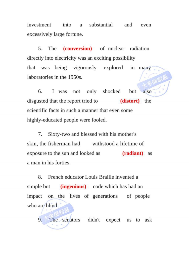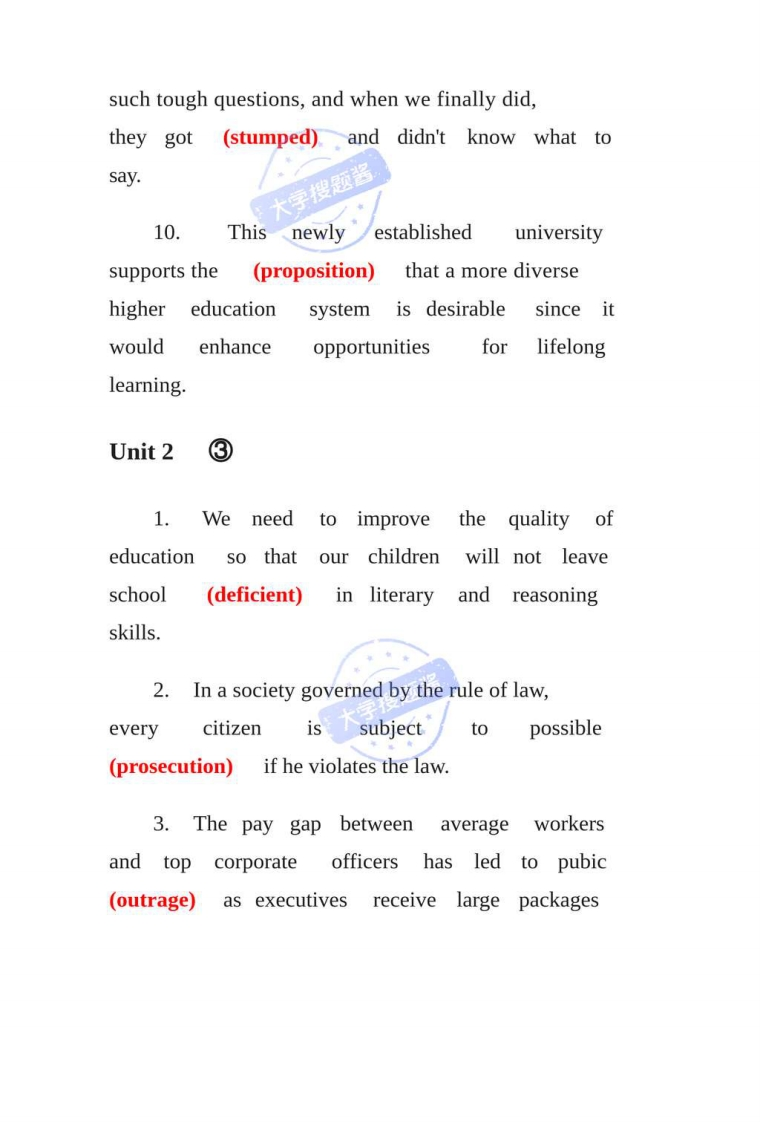 本材料为新视野大学英语4Unit1-Unit5 Section A课后练习根据老师的出题范围有所删减搜题Unit 11.As thegender barriers(crumbled)thenumber of womenworkingas lawyers,doctors.orbankersbegantoincreasesignificantly from the mid-20th century.2.With the data collectedeach year,theownerof the shopcan(discern)customertrendsand howthingslikeweatherandeconomic indicators affect sales performance.3.His supervisorpushesand motivateshim in such a positive manner that he is not onlyable to reach but to(surpass)his personalgoals.4.He is amanwitha(n)(shrewd)businesssense.Hehasbuilthisinitial