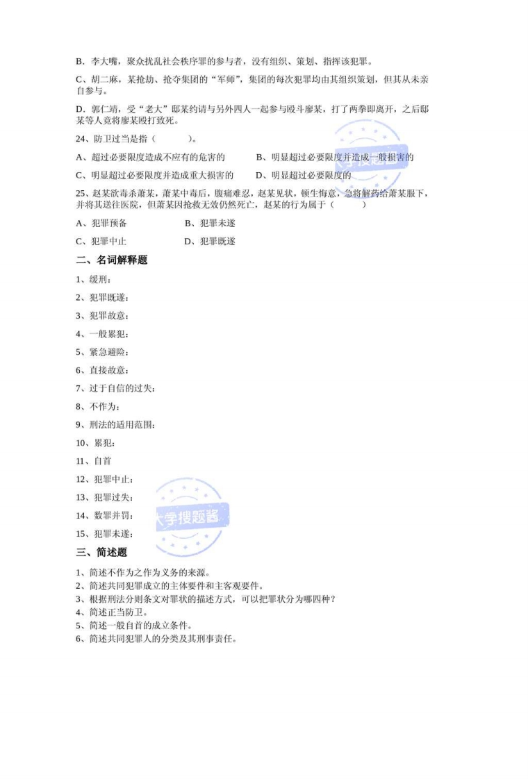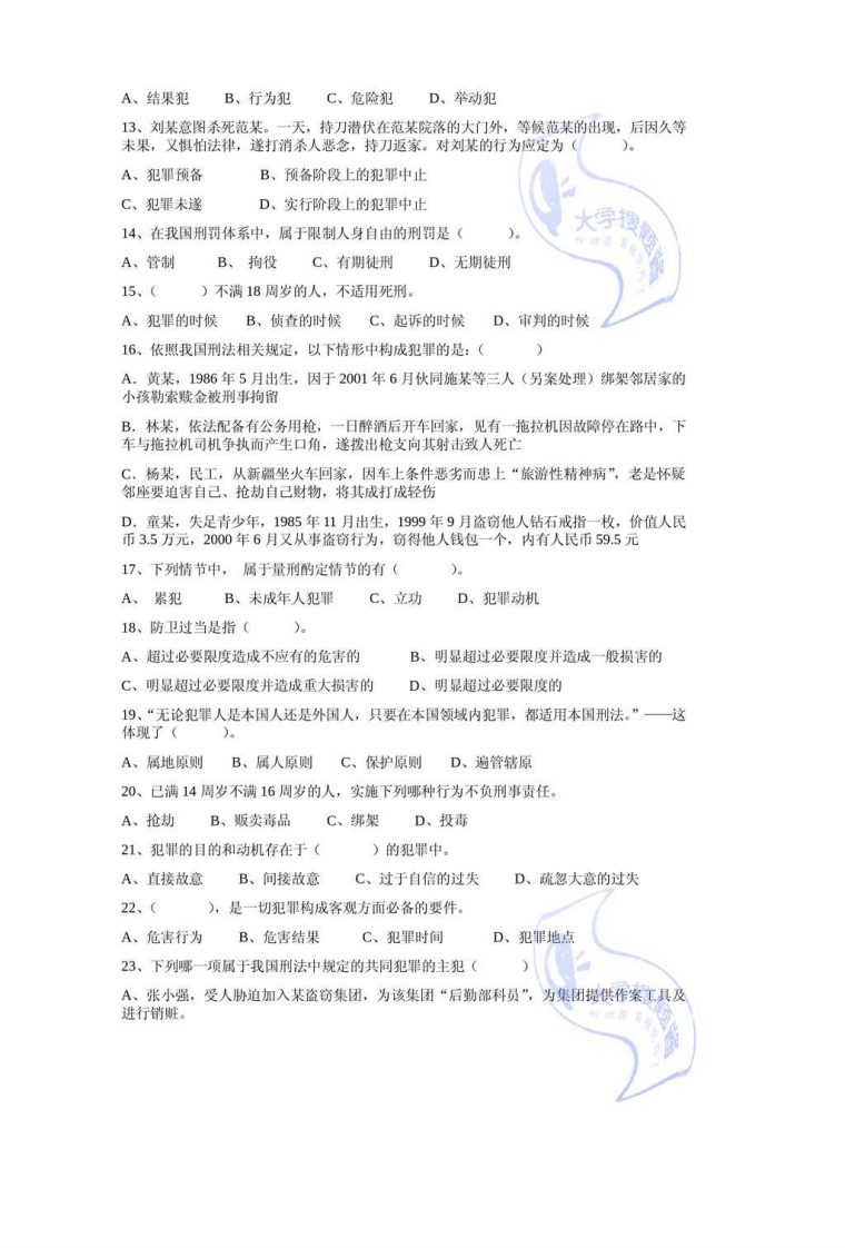《刑法总论》复习思考题一、单项选择题1.刑法与其他部门法相比其所具有的显著特点是(A阶级性B.战斗性C.严厉性D,调整、维护社会关系的广泛性和处罚方法的严厉性2.我国刑法关于潮及力的规定,是采取()。A、从新原则B、从旧原则C、从新兼从轻原则D、从旧兼从轻原则3.我国刑法对于空间效力的规定,采取的是(A属地原厕搜题酱B.属人原则C保护原则D.以属地原则为主,兼采属人原则、保护原则和普遍原则4.犯罪行为的本质特征是(A危害国家和人民利益B.危害社会C违反法律D.应受法律惩罚5.刑法解释,从解释的方法上分类,可分为(A.文理解释和论理解释B.立法解释和学理解释C.司法解释和立法解释D.学理解释和文理解释6,我国刑法的目的是()A惩罚犯罪B预防犯罪C.改造犯罪D.消灭犯罪7.一切犯罪在客观方面必须具备的条件是(A.危害行为B.危害结果C.危害行为和时间、地点D.危害行为与危害结果之间的因果关系8我国刑法规定的完全负刑事责任的年龄是行为人已满(A12周岁B.16周岁C.18周岁D.14周岁9、全国人大常委会法制委员会就刑法修改所作的说明,属于()A、立法解释B、司法解释C、学理解释D、论理解释10、我国刑法关于溯及力的规定,是采取(A、从新原则B、从旧原则C、从新兼从轻原则D、从旧兼从轻原则11、孙某1985年5月生,1998年6月盗窃他人财物价值2380余元:1999年8月抢劫他人手机一部和现金1200余元:2001年10月实施绑架行为时,被抓获。孙某应对(负刑事责任。A、盗窃、抢劫和绑架行为B、抢劫和绑架行为C、盗窃和绑架行为D、绑架行为大字搜题酱12、以法定的犯罪行为的完成作为既遂标志的犯罪,刑法理论上对其称之为(