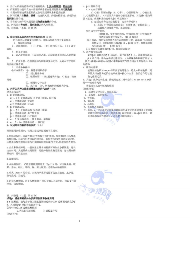 (药理学)期末考试试卷(从卷》11、糖尿病患者高渗性昏迷抢教宜选用(B》A.胰岛素皮下注射名词解释.(25=10分)B,胰岛素静脉注射1、MC:(最低抑菌浓度)能够抑制培养基内细南生长的最低浓C,格6齐特口服度。D.罗格列口服2、半衰期:通常指血浆半襄期,即血浆药物浓度下降一半所需12、下列隔项不属于氨基糖作类药物的不良反应(D】要的时间。A.变态反M3,抗菌语:系泛指一种成一类抗生素(或抗菌药物)所能(成B,神经肌肉阻断作用杀火)微生物的类、属、种范围。C,肾毒性4、受体激动剂:与受体有较强亲和力,又有较强内在活性的药物。D,骨院抑制5、协同作用:协同作用是指不同素对同一生理效应发挥作用,从而达到增强效益的结果。13、阿可匹林的抗血小板作用机制为(A)A,辣制血小板中2的合成二、单项选择。(2*20=40分)辣制内皮细胞中TXA2的合成1、下列抗高血压药物中,里一药物易引起刺激性干咳(B)C.败活不所A.拉米B.卡托普利C氯沙坦D.硝装地平D,促进内皮细胞中PG2的合成2、长期应用糖皮质激素,突然停药不会引起(A)A,脊上腺皮质功能尤进14,极化液常用于心肌梗死并发的心律失常,其中胰岛素有何作用(B)B.上腺皮质功能不全A:加速心肌葡萄糖的氧化以供能C.肾上限危象B.促进K+进入细胞内(D.肾上腺皮质菱缩C,减少游离体,顶防症酸中毒D,纠正低血钾3、2受体阻斯药对下列何种病疗效最好(B)A。结肠溃疡15、地两津的药理作用机制是(C)B.十二指肠流病A,不通过受体,直接抑制中区C,卓-艾综合B,与苯二氮卓受体结合促进G超弘与其受体结合,廷长CI-通道开放时D.口腔溃殇C.与苯二氨草受体结合促进GB弘与其受体结合,增如C1-通道开放频4、巨幼红细胞性贫血病人合并神经症状时必须应用()A.排生素B12D,作用于GABA受体,增强GABA神经元的功能B,叶酸C,红细胞生成素16、异州抗结核杆的作用机制是(A)D.硫酸亚铁A.抑制细菌分枝杆菌酸的合成B,影响细蔺胞质膜的通透性5、肌受体阻断药产生中框抑制作用的机制是(A)C,抑制细菌核酸代谢A,阳斯中根田受体D,物制细细胞壁的合成B。兴奋中枢胆碱受份C.和童尼丁样作用有关17、用于支气管哮喘的药物是(D)D,和中根抗胆碱作用有关A.去甲肾上腺素,肾上腺素B,多巴胺,麻黄碱6、治疗伤寒和副伤寒病的首选药物是(A)C,异丙肾上腺素,多巴胺A氯霉素D,肾上腺素,异丙肾上腺素B.四环素C.土霉素18、对于B受体阻断药不属于转用或慎用的是(B)D.多西环素A.支气管球B,青光眼7、下列有关氨基糖作类抗生茶的叙述错误的是(C)C,外周血管痉李性疾制A,溶液性质较稳定D,心脏传导阻滞B.对革兰阴性南作用强C,易透过血脑屏障,但不易透过监盘19、例托品的下列博一项作用与阻断M受体无关(C)D.抗菌机制是阻碍细南蛋白质的合成A,松弛胃肠平滑肌B。抑制腺体分泌8、有关维生素x的叙述,错灵的是(C)C,扩张血管,改善微循环A,天然维生素贰为所溶性D.瞳孔扩大B.参与凝血因了子的合成C。对于应用链激断所致出血有特效20、对于B受体阻断药不属于禁用或慎用的是(B)D,维生素1注射过快可出现呼吸困难A.支气管球响B.青光眼9,有关胰岛素对糖代谢的影响正确的叙述是(C)外周血管痉家性疾病A.抑制糖原的合成和贮有D.心驻传导阻滞B.或慢简萄糖的氧化和酵制C,抑制糖原分解D.加速糖原异生填空.12070分,药物从用药部位机体到离开机体,经过吸收、分布、代谢10、下列哪种情况不首选胰岛素(A)和排淮几个过程。A.Ⅱ型糖尿病惠者经饮食治疗无效今2、药物不良反应包括副反应、毒性反应、过敏反应、居遗效应和停B.1型糖尿病药家合,C,糖尿病并发黑重感染3、降血糖药共同的主要不良反应是低血糖D.好解糖尿病!受体激动时,心血管物制、内脏平滑肌兴奋(收缩加强)、瞳孔扩大、腺体分泌增加·
