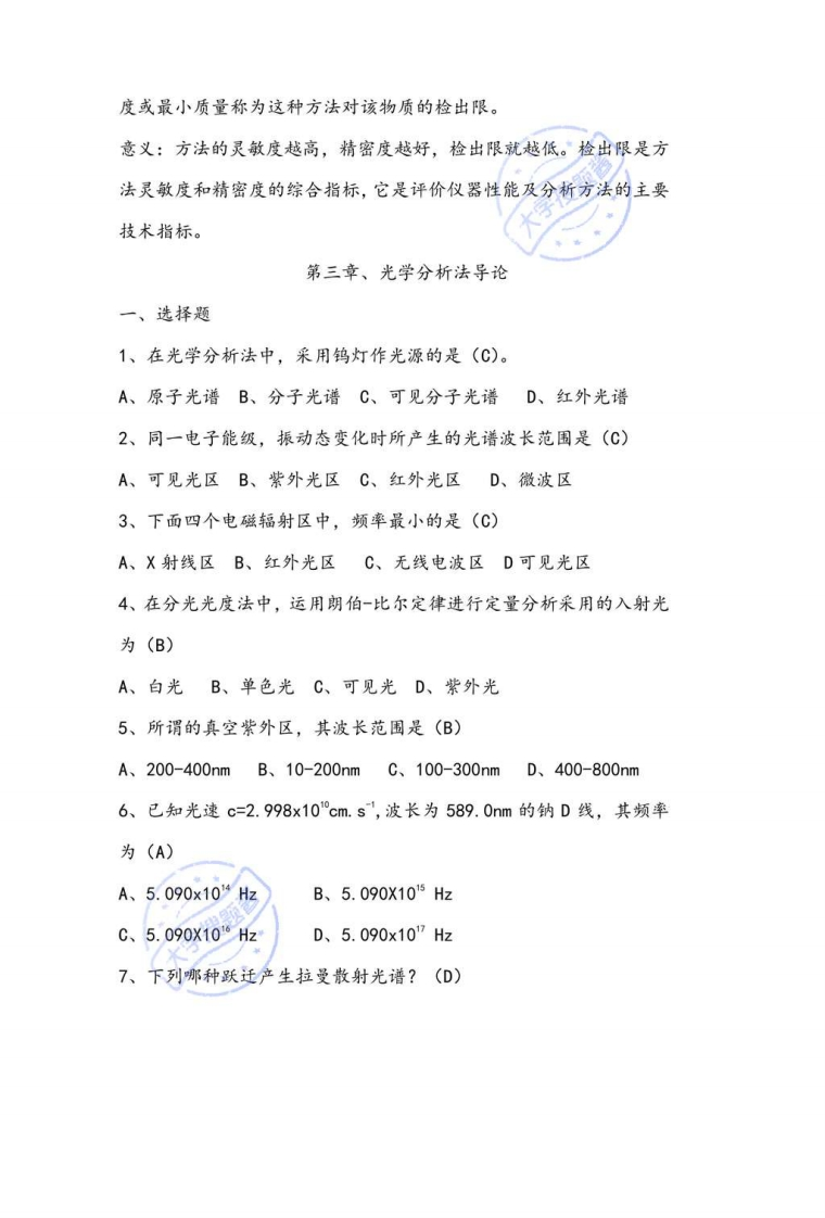 第一章、绪论一、选择题1、利用电流-电压特性进行分析的相应分析方法是(C)字搜题酱A、点位分析法B、电导法C、极谱分析法D、库仑法2、利用两相间分配的分析方法是(D)A、光学分析法B、电化学分析法C、热分析法D、色谱分析法3、下列哪种分析方法是以散射光谱为基础的?(D)A、原子发射光谱B、X荧光光谱法C、原子吸收光谱D、拉受光谱法4、下列分析方法中,哪一个不属于电化学分析法?(D)A、电导分析法B、极谱法C、色谱法D、伏安法5、仪器分析与化学分析比较,其灵敏度一般(A)A、比化学分析高B、比化学分析低C、相差不大D、不能判断6、仪器分析与化学分析比较,其准确度一般(B)A、比化学分析高B、比化学分析低C、相差不大D、不能判断7、仪器分析法与化学分析法比较,其优,点是(ACDE)A、灵敏度高B准确度高C、速度快D、易自动化E、选择性高8、下列分析方法中,属于光学分析法的是(AB)A、发射光谱法B、分光光度法C、电位分析法D、气相色谱法E、极谱法9、对某种物质进行分析,选择分析法时应考虑的因素有(ABCDE)A、分析结果要求的准确度B、分析结果要求的精确度C、具有的设备条件D、成本核算E、工作人员工作经验