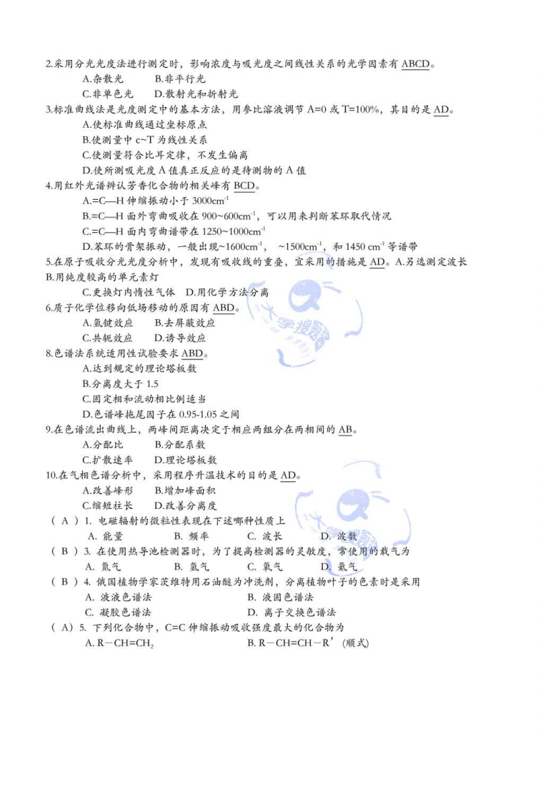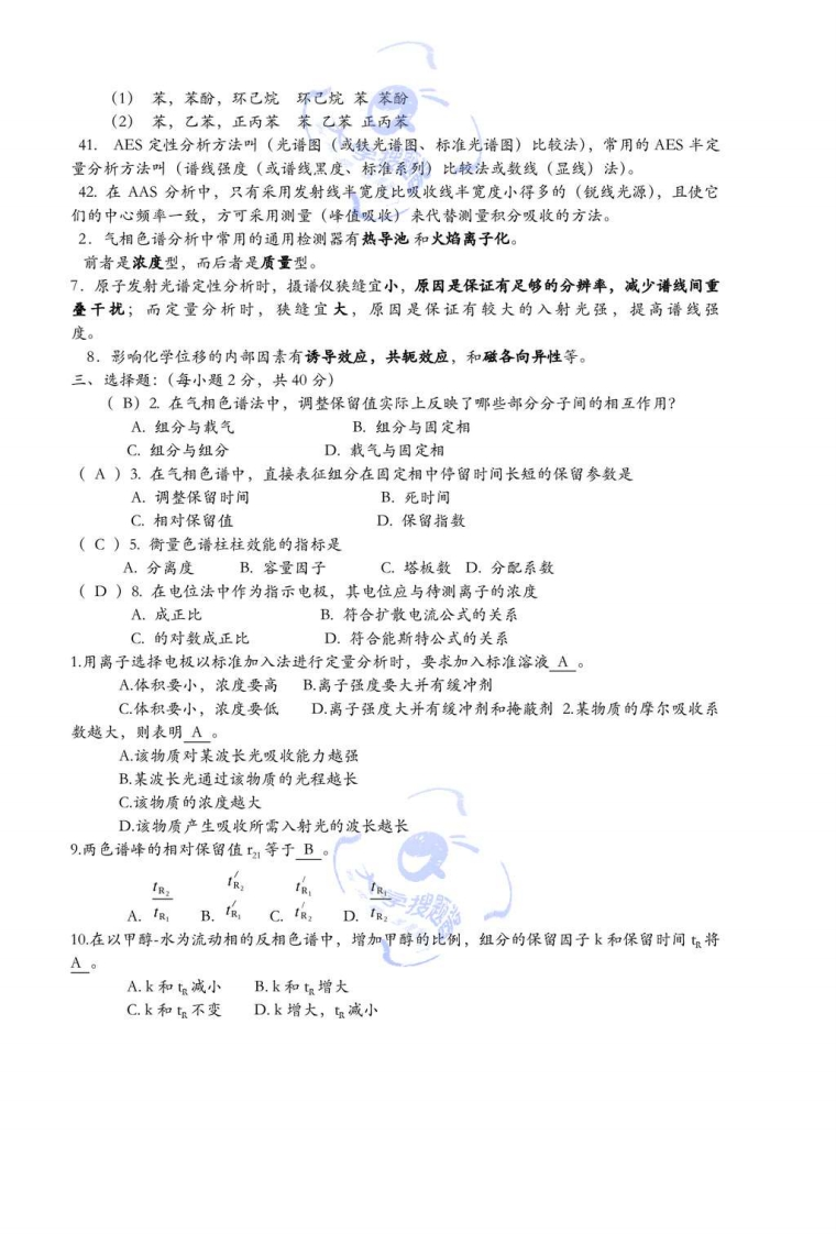 一、名词解释:4.多普勒变宽:原子在空间作无规则热运动所引起的变宽,称为热变宽或多普勒变宽。5.保留时间:从进样开始到色谱峰最大值出现时所需要的时间。7.原子发射光谱:当基态原子吸收外界能量(如电能、热能等)跃迁到激发态后,由高能态跃迁回基态而产生的光谱。tg-Tu T09.相对保留值:相对保留值也称选择性因子,其定义为:式中和%分别为组分2与基准组分1的调整保留时间。二、填空题:(每空1分,共20分)】·按被作用物质的本质可分为分子光谱和原子光潘。3.在气相色谱分析中用热导池作检测器时,宜采用H2作载气,氢火焰离子化检测器进行检测时,宜用N2作载气。4.在色谱分析中,用两峰间的距离来表示柱子的选择性,两峰间距离越大,则柱子的选择性越好,组分在固液两相上的热力学性质相差越大。10.原子吸收光谱是由气态物质中基态原子的外层电子的跃迁而产生的。11.尼柯尔斯基Nicolsky)方程式%=情±2.303欢7ZFga,+∑K0;12),其中K被称为电位选择性系数,它可以用来估计干扰离子带来的误差,玻璃膜钠电极对钾离子的电位选择性系数为2×103,这意味着电极对钠离子的敏感响应为钾离子的500倍。13.原子吸收光谱是由气态物质中基态原子的外层电子的跃迁而产生的。14.晶体膜氯、涣和碘离子选择电极的敏感膜均由其相应的银盐制成,它们的灵敏度由低到高的次序为C15.某离子选择性电极,其选择系数为K,当K<1时,表明电极对i离子的响应较对j的响应大;当>1时,表明电极选择性倾向j离子;当K=1时,表明电极对j离子的响应相等。23。气相色谱仪由如下五个系统组成:气路系统,进样系统,分离系统,温控系统、检测和记录系统。24.高压液相色谱仪的工作过程是:当试样进入进样器时,经进样器的溶剂将试样带入色谱柱分离,被分离后的试样按先后顺序进入检测器,它将物质的浓度信号变成电信号,由记录仪记录下来,即得到一张液相色谱图。28。原子线的自然宽度是由原子在激发态的停留时间引起的,原子吸收光谱线的多谱勒变宽是由原子在激发态的停留时间而产生的。30.根据固定相的不同,气相色谱法分为气液色谱和气固色谱。31,测定pH值时玻璃电极的电位随氢离子浓度的改变而变化,而参比电极(或饱和甘汞电极SCE)电极的电位固定不变。34.在原子吸收光谱线变宽的因素中,多普勒变宽是由于原子不规则热运动;自然变宽是由于与原子激发态寿命有关(或测不准原理)。指出试样中各组分的流出先后顺序。