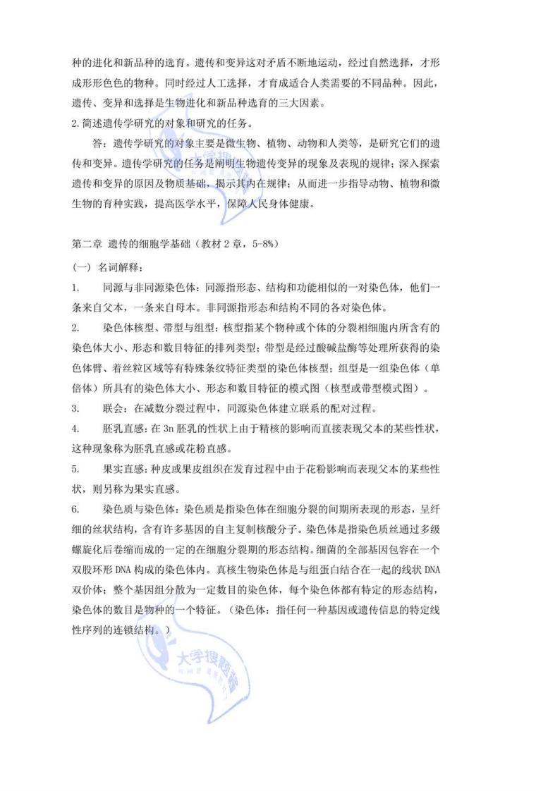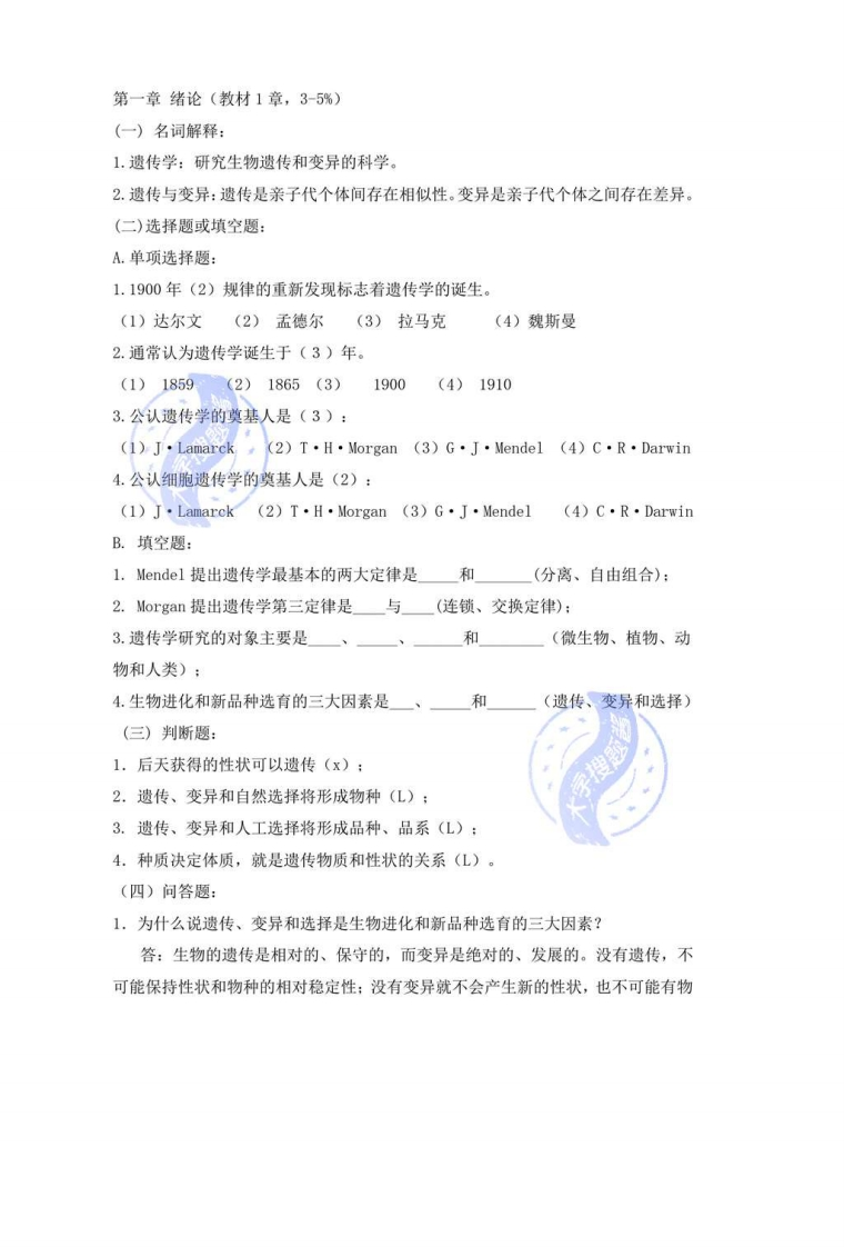 《遗传学》试题库适用于生物科学、生物技术本科方向一、《遗传学》各章及分值比例:(X%)(一)绪论(3-5%)(二)遗传的细胞学基础(5-8%)(三)孟德尔遗传(12-15%)(四)连锁遗传和性连锁(15-18%)(五)数量性状的遗传(10-13%)(六)染色体变异(8-10%)搜题(七)病毒和细菌的遗传(5-7%)(八)遗传物质的分子基础(5-7%)(九)基因突变(8-10%)(十)细胞质遗传(5-7%)(十一)群体遗传与进化(10-12%)二、试题类型及分值:(仪分/每题):1.名词解释(3-4)2.选择题或填空题(1-1.5)3.判断题(1-1.5)4.问答题(5-7)5.综合分析或计算题(8-10)三、各章试题和参考答案:试题库搜题