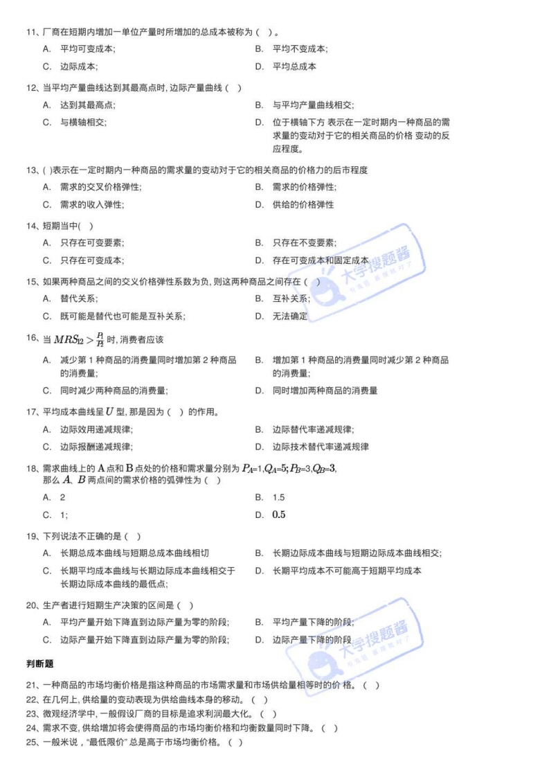 云南财经大学期末考试卷(微观经济学)单选题1、一般来说,需求曲线是向()倾斜的。A.右上方B.右下方:C.左上方:D.左下方。搜题酱2、当生产某种产品所使用的生产要素价格上涨而其他条件不变时,该种产品的市场供给量一般来说将会()A.增加B.不变C.减少;D.可能增加也可能减少3、当人们的收入下降而其他条件不变时,对“正常商品”的需求将会()A.增加B.减少;C.不变!D.可能增加也可能减少4、对于手机价格上涨了,那么在其他条件不变的情况下,可以预测()A.这家厂商对于计算机的供给量将会相对增加;B.这家厂商对于计算机的供给量将会不变:C.这家厂商对于计算机的供给量将会相对减少:D.这家厂商对于手机的供给量将会相对增加5、如果商品A和商品B互为替代品,那么商品A的价格下降将造成A.商品A的需求曲线向右移动:B.商品A的需求曲线向左移动:C.商品B的需求曲线向右移动:D.商品B的需求曲线向左移动6、下图给出了某种商品的市场需求与市场供给曲线,如果目前市场实际价格等于图中的品,那么我们可以预期价格的变化趋势是()A.上升:B.不变C.下降;D.可能上升也可能下降7、均衡价格一般是随着()A.需求和供给的增加而上升:B.需求和供给的减少而上升C.需求的减少和供给的增加而上升:D.需求的增加和供给的减少而上升8、商品A的需求曲线向右下方倾斜,当其他因素保持不变时,商品A自身价格上升将导致A.商品A供给增加:B.商品A供给量增加:C.商品A需求增加:D.商品A需求量减少9、如果某一商品的需求价格弹性小于1,则该商品价格上升将导致商或生产者出售该商品所得收入().A.增加B.减少C.友变D.无法确定10、当消费者收入增加而商品价格保持不变时,预算线将()A.向右平移;B.向在平移;C.保持不变:D.围绕某一点发生旋转