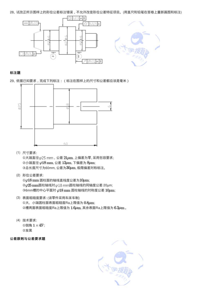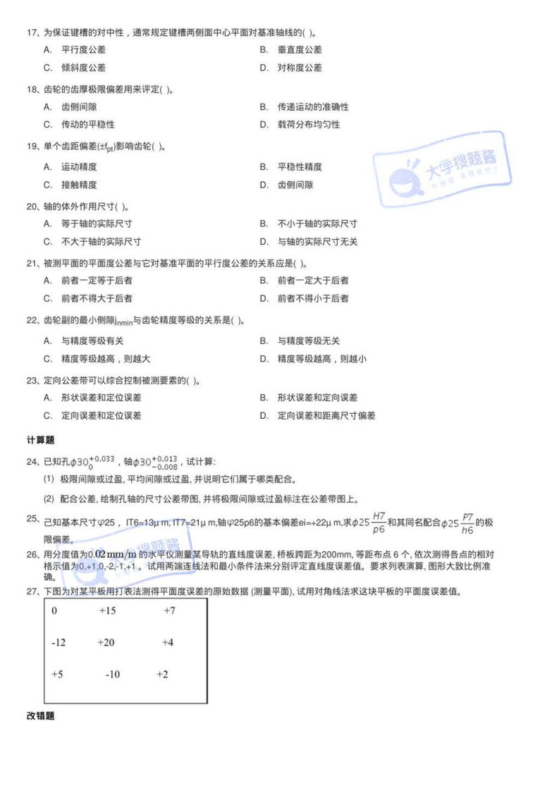 长安大学期末考试试卷(互换性与技术测量)填空题1、一般地,根据零部件互换性程度的不同,互换性可分为和2、R10数系的公比为,每逢项,数值增大10倍。3、根据使用要求的不同,圆柱结合可归纳为以下三类:4、配合是指相同的、相互结合的孔轴公差带之间的关系。5、端面圆跳动公差带控制端面对基准轴线的程度,也控制端面的6、+0.023p90H70的最大实体尺寸为mm.0三大学搜p30h6的最大实体尺寸为mm.-0.0137、包容要求适用于8、滚动轴承外圈固定内圈旋转,受离心力P,的作用,则内圈承受负荷:外圈承受负荷。单项选择题9、互换性的技术基础是(。A.大量生产B.公差C.检测D.标准化10、优先数系中R10/3系列是()。A.基本系列B.补充系列C.派生系列D.等差系列11、用公法线千分尺测量齿轮公法线长度的方法属于()。A。相对测量法B.绝对测量法C.综合测量法D.间接测量法12、p40f6,p40f7和p40f8的相同偏差是()。A.下偏差B.上偏差C.实际偏差D.公差13、基本偏差代号为从、K、M的孔与基本偏差代号为h的轴可以构成()A.间隙配合B.间隙或过渡配合C.过渡配合D.过盈配合14、按同一图样加工一批轴,各个轴的体内作用尺寸()A.相同B.不一定相同C.大于最大实体尺寸D.小于最小实体尺寸15、图样上标注的形位公差值前面没有时,则被测要素的公差带形状应为(。A.两平面B.两直线学搜题酱C.距离或半径差D.两平面、两直线、两圆间距离或半径差16、在取样长度内,轮廓单元宽度Xs的平均值是()。A.RaB.Rmr(c)C.RzD.RSm