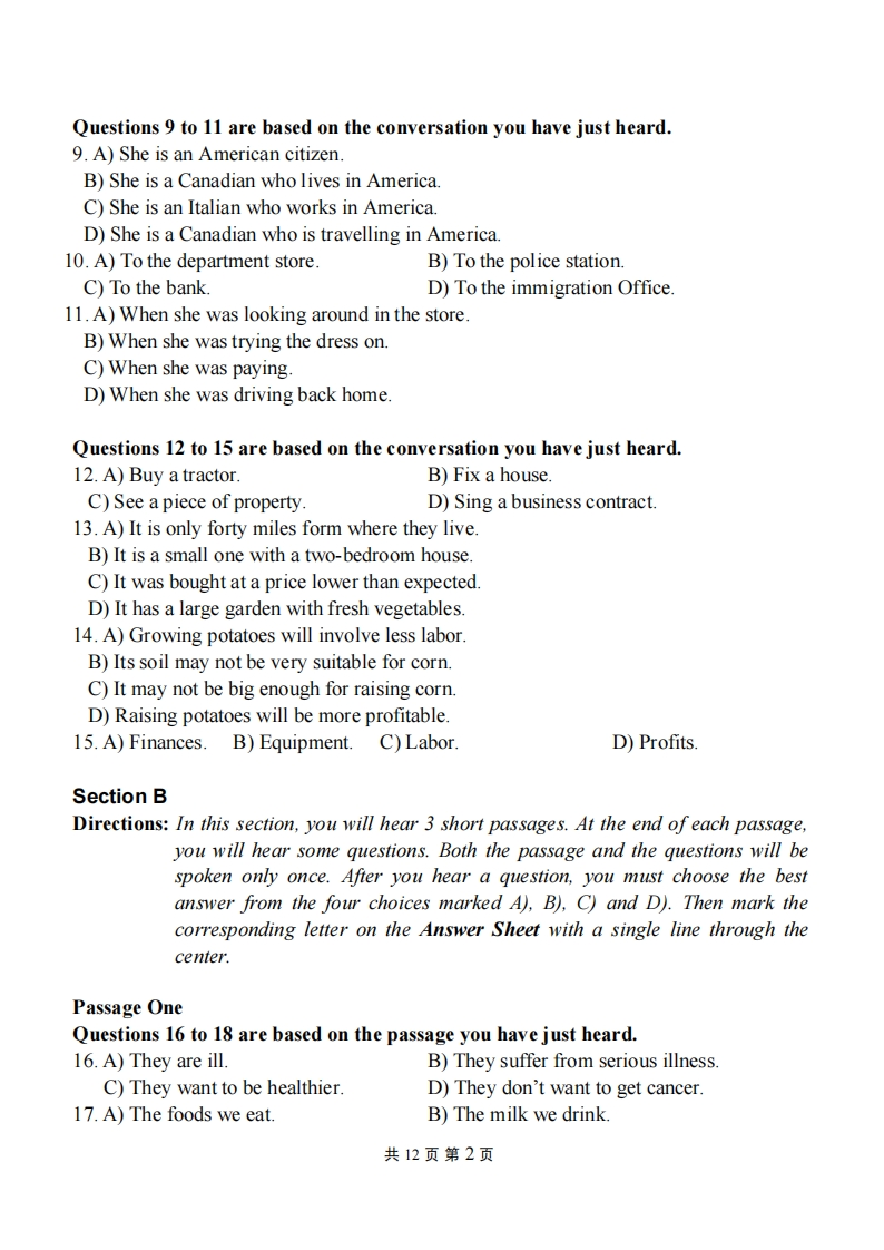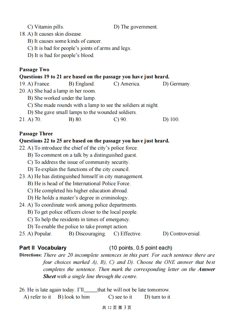浙江大学2020-2021学年第二学期大学英语期末考试试卷Part I Listening Comprehension(25 points,1 point each)Section ADirections:In this section,you will hear 8 short conversations and 2 long conversations.At the end of each conversation,one or more questions will be asked aboutwhat was said.Both the conversation and the questions will be spoken onlyonce.After each question there will be a pause.During the pause,you mustread the four choices marked A),B),C)and D),and decide which is the bestanswer.Then mark the corresponding letter on the Answer Sheet with a singleline through the centre.1.A)Only true friendship can last long.B)Letter writing is going out of style.C)She keeps in regular touch with her classmates.D)She has lost contact with most ofher old friends.2.A)A painter.B)A mechanic.C)A porter.D)A carpenter.3.A)Look for a place near her office.B)Find a new job down the street.C)Make inquiries elsewhere.D)Rent the $600 apartment.4.A)He prefers to wear jeans with a larger waist.B)He has been extremely busy recentlyC)He has gained some weight lately.D)He enjoyed going shopping with Jane yesterday.5.A)The woman possesses a natural talent for art.B)Women have a better artistic taste than men.C)He isn't good at abstract thinkingD)He doesn't like abstract paintings.6.A)She couldn't have left her notebook in the library.B)She may have put her notebook amid the journals.C)She should have made careful notes while doing reading.D)She shouldn't have read his notes without his knowing it.7.A)She wants to get some sleep.B)She needs time to write a paper.C)She has a literature class to attend.D)She is troubled by her sleep problem8.A)He is confident he will get the job.B)His chance of getting the job is slim.C)It isn't easy to find a qualified sales manager.D)The interview didn't go as well as he expected共12页第1页