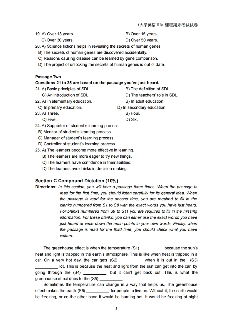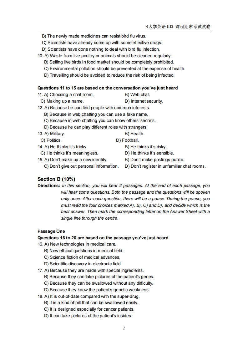 《大学英语Ⅲ》课程期末考试试卷浙江大学《大学英语川》期末考试试卷2019-2020学年第二学期A卷Part IListening Comprehension(35%)Section A(15%)Directions:In this section,you will hear 5 short conversations and 2 long conversations.At the end of each conversation,one or more questions will be asked aboutwhat was said.Both the conversation and the questions will be spoken onlyonce.After each question,there will be a pause.During the pause,you mustread the four choices marked A),B),C)and D),and decide which is the bestanswer.Then mark the corresponding letter on the Answer Sheet with asingle line through the centre.1.A)Canada.B)Australia.C)America.D)France.2.A)At a hotel.B)At an airport.C)At a restaurant.D)At a travel agency.3.A)A shop assistant.B)Apoliceman.C)A travel agent.D)A customs officer.4.A)Because she had no interest in French.B)Because she didn't want too much trouble in finding a job.C)Because she had a hard time leaming French.D)Because she was good at computer programming.5.A)Send the ingredients to the woman by mail.B)Have Chinese food in Kensington High Street.C)Invite the woman to have Chinese food at home.D)Go to the supermarket with the woman.Questions 6 to 10 are based on the conversation you've just heard6.A)Study report.B)Bird flu viruses.C)Drugs for bird flu.D)Traveling.7.A)Treating patients infected by bird flu viruses.B)Observing human-to-human virus transmission.C)Making a study report on bird fluD)Giving instructions on bird flu prevention.8.A)By eating excessive dead birds or poultry.B)By injecting virus infected blood into human body.C)By contacting polluted bird waste.D)By wearing clothes made from bird feathers.9.A)The effectiveness of the medicines must be proved.