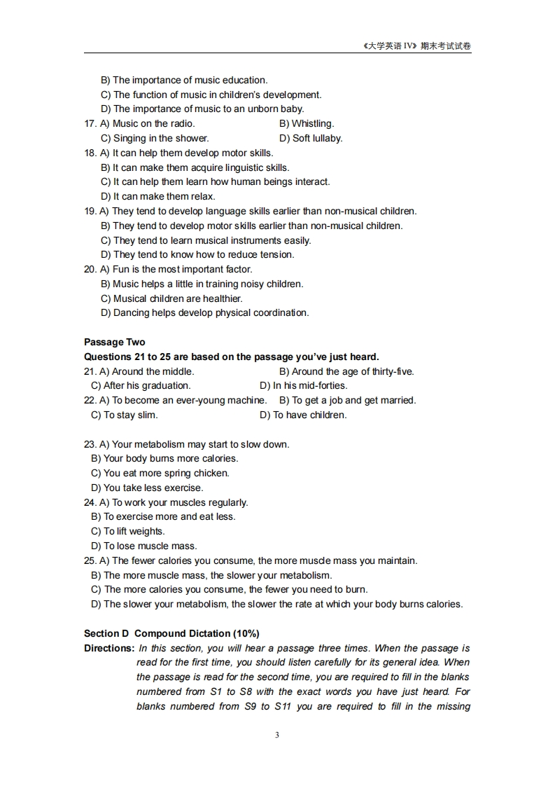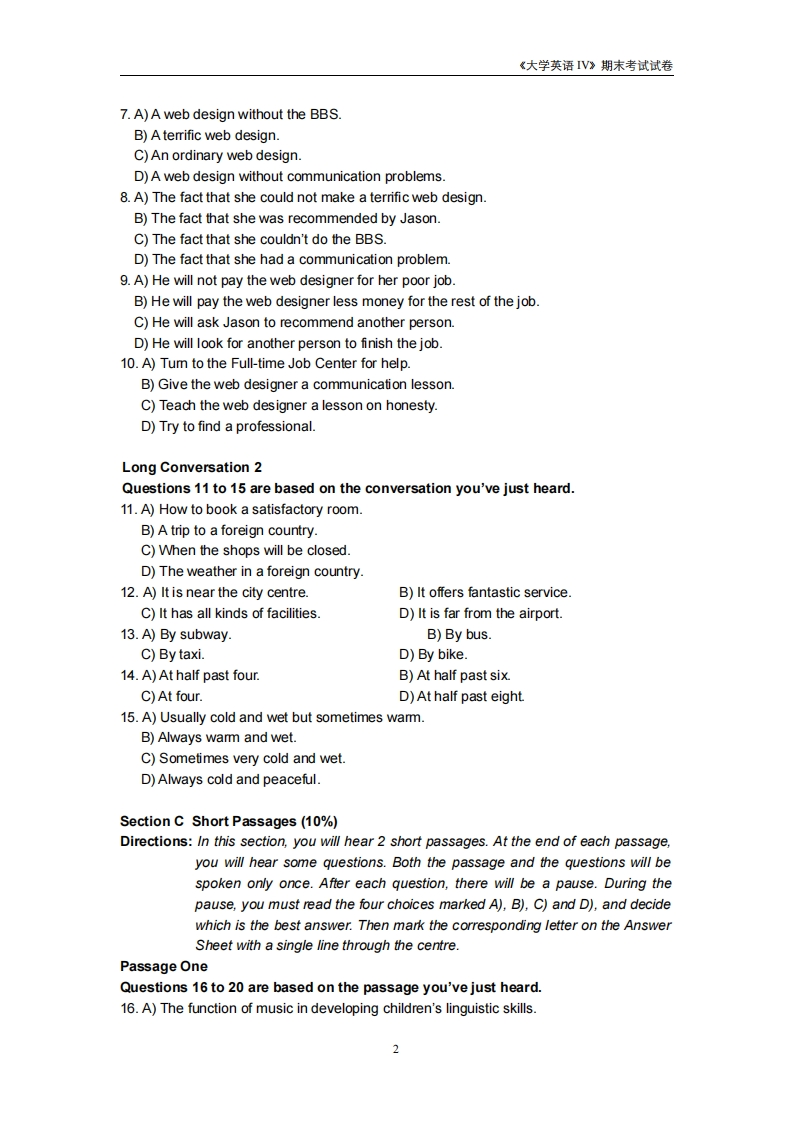 《大学英语IV》期末考试试卷浙江大学《大学英语V》期末考试试卷2020-2021学年第二学期A卷Part I Listening Comprehension(35%)Section A Short Conversation(5%)Directions:In this section,you will hear 5 short conversations.At the end of eachconversation,one question will be asked about what was said.Both theconversation and the questions will be spoken only once.After eachquestion,there will be a pause.During the pause,you must read the fourchoices marked A),B),C)and D),and decide which is the best answer.Then mark the comesponding letter on the Answer Sheet with a single linethrough the centre.1.A)Near an art museum.B)At a science exhibit.C)At a news conference.D)Near a paint store.2.A)$9.5.B)$25.5.C)$16D)$6.5.3.A)Her injury had kept her at home.B)She had to wait for othersC)She had other things to do.D)Her foot had seemed all right.4.A)Apologize to Donna.B)Confront Donna directly.C)Excuse Donna's behavior.D)Write Donna a letter.5.A)AjournalistB)An accountant.C)Aclerk.D)A math teacherSection B Long Conversation (10%)Directions:In this section,you will hear 2 long conversations.At the end of eachconversation,5 questions will be asked about what was said.Both theconversation and the questions will be spoken only once.After eachquestion,there will be a pause.During the pause,you must read the fourchoices marked A),B),C)and D),and decide which is the best answer.Then mark the corresponding letter on the Answer Sheet with a single linethrough the centre.Long Conversation 1Questions 6 to 10 are based on the conversation you've just heard.6.A)Because the web designer can not complete the task.B)Because the web designer left when she got the job half done.C)Because the web designer does not like the part-time job.D)Because the web designer does not know the BBS.