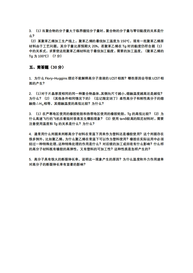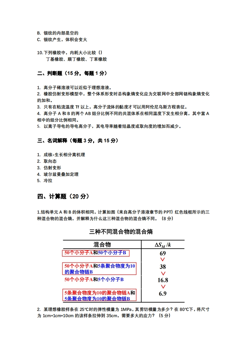 浙江大学2021-2022学年秋冬学期高分子物理期考试卷一、选择题(多选,每题2分,共20分。少选得1分,每选错一个选项倒扣1分)1.在GPC测定中,绝对分子量相同的线形聚乙烯A和支化聚乙烯B,下列说法正确的是()A.A的流体力学半径更小B.A的淋出时间更短C.A的均方旋转半径更大D.A和B的淋出时间相同2.关于高分子的立体异构,以下说法正确的是()A.等规聚合物的所有结构单元都是同一种旋光异构体B.等规PMMA的Tg比间规PMMA的低C.聚丁二烯只有顺反异构,没有旋光异构D.不同立体异构的同一种聚合物,其链构型和结晶性质不同3.对于高分子溶解过程的物理量△HM,△S,X,A2,u,H,△山(过量化学位),在良溶剂中,以下物理量的关系式一定成立的有()A.△HM<0B.△HM>0C.△S<0D.△Sw>0EX<0.5FX>0.5G.A2<0H.A2>01.u<0J.u>0K△4<0L.△4>0M.△h<0N.△μ1>04.在结晶聚合物中加入成核剂,下列说法正确的是()A.异相成核数量增加B.结晶度提高C.球晶尺寸变大D.结晶速率提高E.透明度提高5.下面玻璃化转变温度比较正确的是()A.聚甲醛>聚氧化乙烯B.聚异丁烯>聚二甲基硅氧烷C.聚(1,2-二氯乙烯)>聚氯乙烯D.聚丙烯>聚氢化(1,4-异戊二烯)E.聚(4-乙烯基吡啶)>聚苯乙烯8.一Maxwell单元发生应力松弛,原应力为10MPa,运动单元的E和n已知,求经过一个松弛时间后的应力大小9.下列有关银纹的说法正确的是A.银纹平行于张应力方向