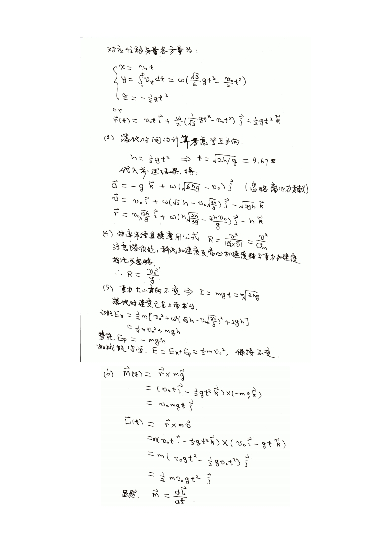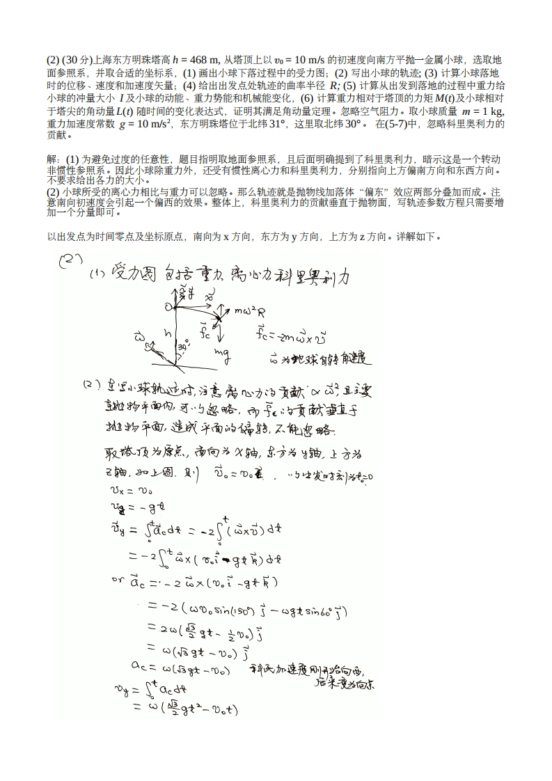 浙江大学2018-2019学年第二学期《力学》课程期末考试试卷课程号:061Q0008开课学院:理学部考生姓名:学号:所属院系:题序二三四五总分得分40 cm(1)(15分)如右图所示,一个3:4:5的斜面固定在一个转盘上,一个质量为1kg的木块静止在斜面上,木块和转盘中心的水平距离为40cm,斜面和木块之间的静摩擦系数为μ=0.25,求使木块不至于下滑(靠向中心)的最小角速度,并给出木块相应的角动量大小。(g=10m/s2)解:取转动坐标系如图1,63木块所受的作用力有重力m8,静摩擦力f,法向支撑力N和惯性力P,其中f=4,N,P=mw2r.列出力的平衡方程式mgsin0=P cos0+u.N,N=mgcos9+P sin0.将后一式代入前一式中,mgsin0=P cos0+u,mgcos0+u,Psin0.图1.62图1.63故P=sin0-u,cos0co90+4,8in日mg,所以w=in9-,c0s9.g=8cos0+u,sin r 19 r=0.95所以w=g3.2rad/s.y0.95角动量大小0.512kgm2s(上述计算中采用了g=9.8ms2)本题主要考察非惯性系(或惯性系)中的力学平衡问题以及角动量基本概念。