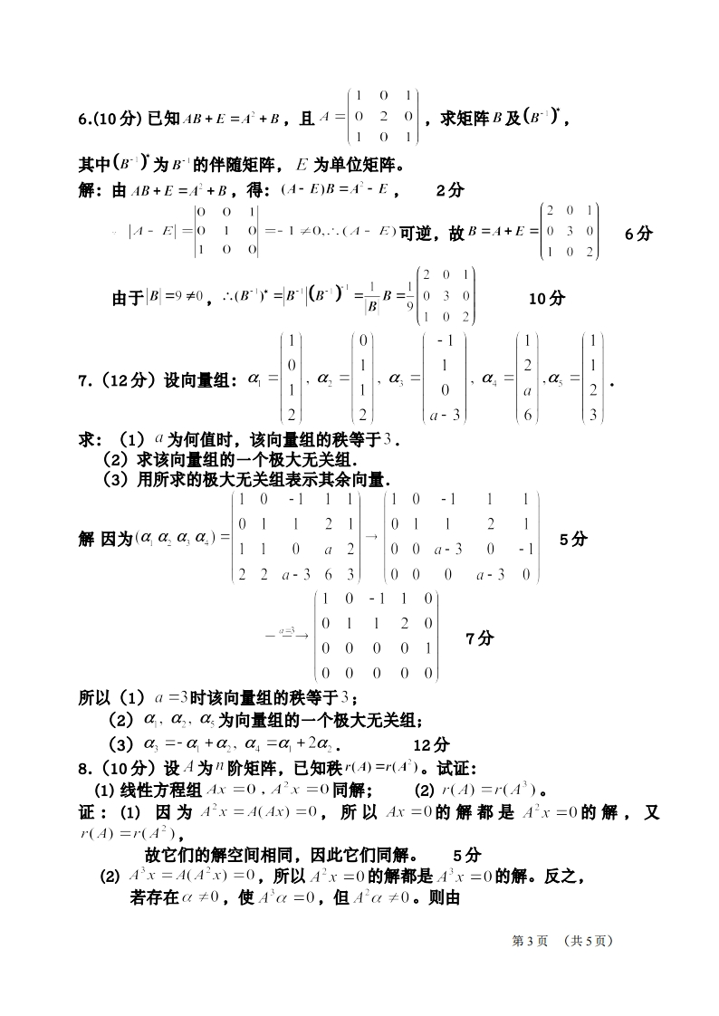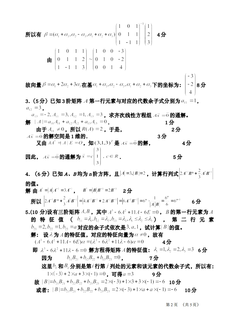 浙江大学2020-2021学年第二学期期末考试线性代数C试题(A卷)解答21.(5分)已知矩阵A=求矩阵A2020及其秩r(4220).-3-6-12282解由A三-22二-2(124),(124)1-2=-92分-3-6-12-3-3222020111而1-2(124)-2(124)-2(124).2(124)-3-3-3-32248=-920191-2(124)=-92019-223分-33-6-12248A2020=-920191故-212且r(420)=1.5分-3-6-122.(8分)已知4,%2,《为R的一组基,证明:4+%,42《,%+43+%也是R的一组基,并求向量阝=4+22+3在基+《,2·,%+2+以下的坐标。101解由(4+4,44,4+4+4)=(,42,4)0112分1-1110而011=1≠0故a+,,4,+4,+,也是R的一组基。1-11又B=%+243+3%3=(4,,4)233分第1页(共5页)