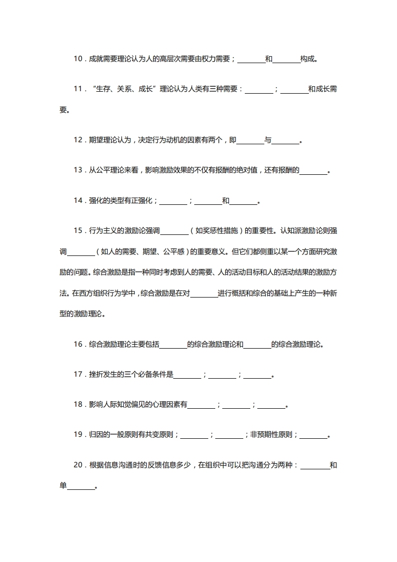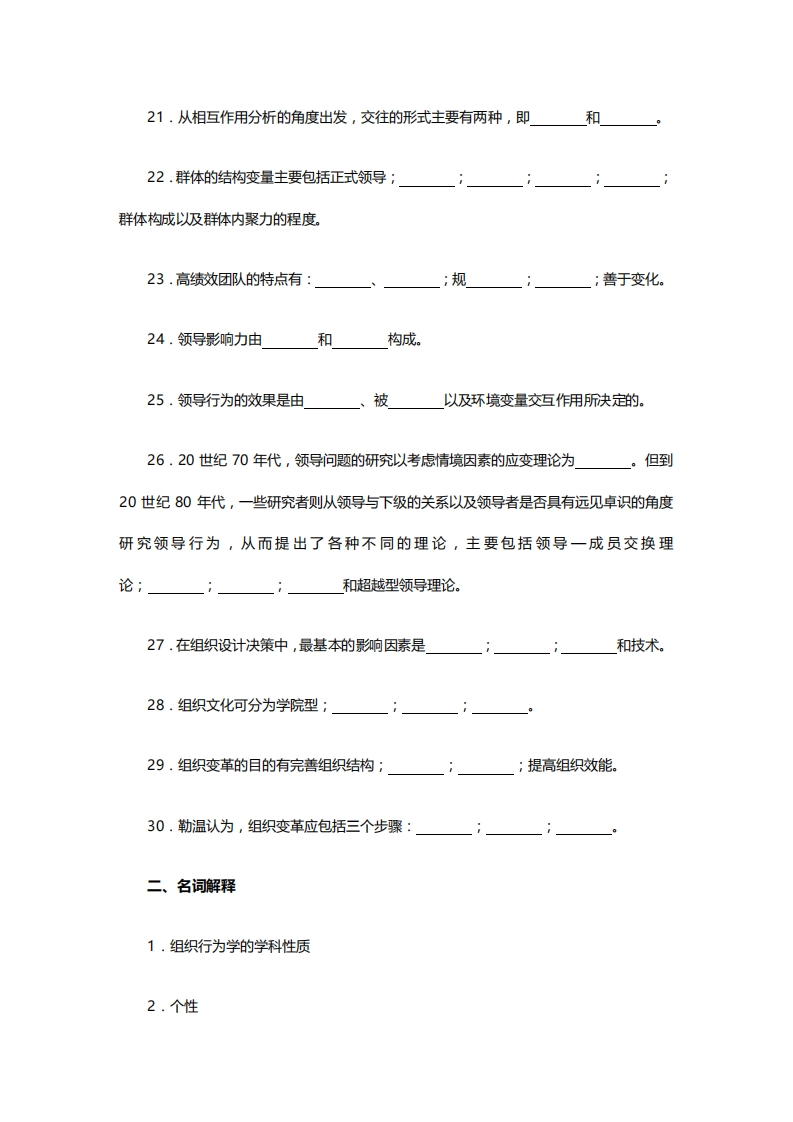 浙江大学2021-2022学年第一学期《组织行为学》试题考试形式:闭卷一、填空题1·我国组织行为学的研究内容主要集中在以下五个方面,即:2组织行为学常见的研究方法有:3.个性心理特征包括:4.能力差异表现为:5.性格形成和发展的影响因素有:;学校教育因素;6.动机的产生主要依赖两个条件:其一是个体因缺乏某种东西而引起的需要(驱力或欲望):其二是7.激励的理论主要包括:8.需要层次理论认为人的需要有:尊重的需要、自我实现的需要。9.双因素理论实为激励因素;保健因素理论,简称为””