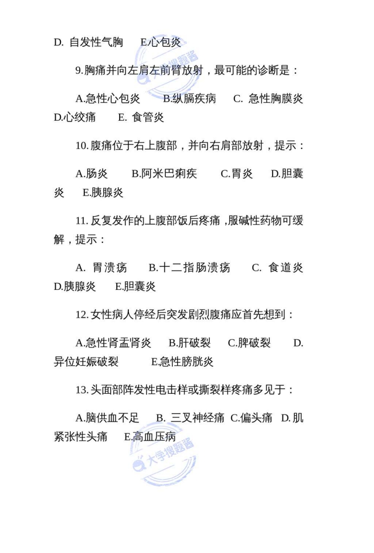 常见症状、选择题大学爱的1.正常人腋测法体温为:A.36.5~37℃B.3637℃C.36.3≈37.2℃D.36.5~37.5℃E.36.5~37.7℃2.6岁男孩,发病第1天体温为37.5度,伴咽痛,未予治疗,第2天体温达41度,伴神志恍惚及抽搐。经输液,抗生素等治疗,第3天体温降至38.2度,其体温变化过程:A.低热→过高热→中等热B中等热→高热一中等热C.低热→高热→高热D.中等热→过高热→中等热E低热→高热→中等热3.发热最常见的原因是:A.颅脑损伤B变态反应C.无菌性坏死物质的吸收D.内分泌与代谢障碍E感染大学搜题酱有发总器留就对