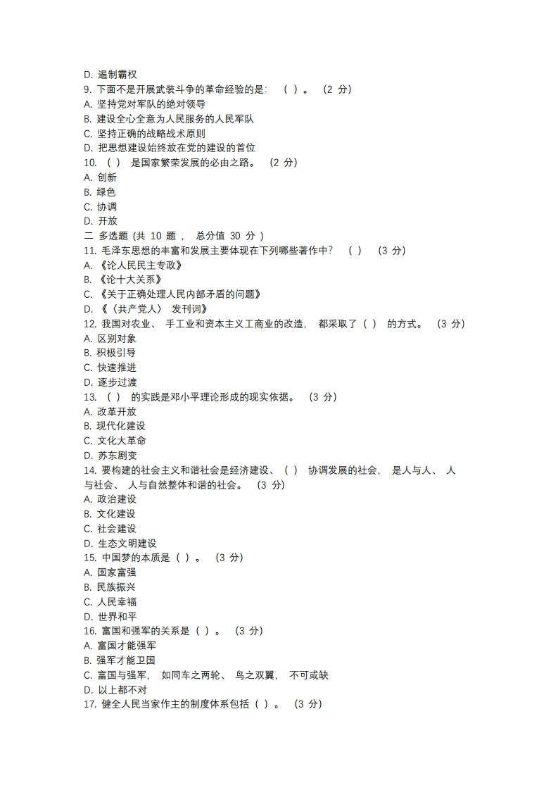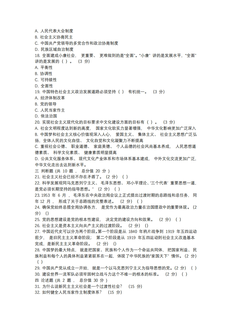 郑州大学《毛泽东思想和中国特色社会主义理论体系概论》2020-2021学年第二学期期末试卷一单选题(共10题,总分值20分)1.1952年下旬至1956年初,这段时间被称为是()。(2分)A.社会主义革命时期B.新民主主义社会时期C.社会主义社会时期D.资本主义社会时期2.()成为时代主题是邓小平理论形成的时代背景。(2分)】A.战争与革命B.和平与发展C.改革与发展D.发展与和平3.“三个代表”重要思想是在()的基础上提出来的。(2分)A.科学判断党的历史方位和总结历史经验B.发展社会主义经济C.中国共产党成为执政党D.全面建设小康社会4.2004年9月,党的十六届四中全会通过的《中共中央关于加强党的执政能力建设的决定》,把树立和落实()作为提高党的执政能力的重要内容。(2分)】A.与时俱进B.三步走C.科学发展观D.民主政治5.坚持一个中国原则和(),推动两岸关系和平发展。(2分)A."九三共识B."九二共识”C."九一共识”D.以上都不是6.()是强国的基石。(2分】A.制度B.经济C.共同富裕D.军事强大7.实现中国梦必须弘扬中国精神,这就是以爱国主义为核心的民族精神和以()为核心的时代精神。(2分)A.改革创新B.改革发展C.艰苦奋斗D.独立自主8.强调要反对霸权主义,维护世界和平,坚持在()基础上发展同所有国家的友好合作关系(2分)A.独立自主B.和平共处五项原则C.合作共赢