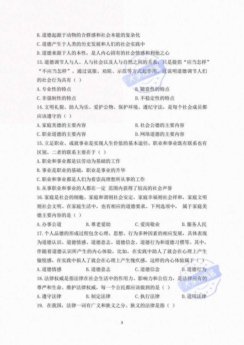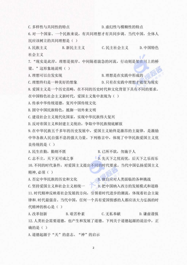 郑州大学2021-2022学年第1学期《思想道德与法治》期末考试试卷班级:姓名:学号:一、单项选择题(本大题共25小题,每小题2分,共50分)1.人生观是人们在实践中形成的对于人生目的人生态度、人生价值等问题的总看法和总观点。其中,人生态度回答的是()A.人为什么活着B.人的本质是什么C.人应该怎样对待生活D.什么样的人生才有意义2.习近平告诚青年:“人的一生只有一次青春。现在,青春是用来奋斗的:将来,青春是用来回忆的。·.·只有进行了激情奋斗的青春,只有进行了顽强拼搏的青春,只有为人民作出了奉献的青春,才会留下充实、温暖、持久、无悔的青春回忆。”这段话告诉我们,人生的价值在于()A.个人的生存和发展B.个人的心理平衡、心态良好C.个人物质和精神需要的满足D.个人为他人和社会所作的贡献3.人际交往中,由于性格、经历、文化、修养等的差异,难免会产生矛盾,这就要求人与人互相理解,求同存异,不在非原则问题上斤斤计较。这是人际交往中应该遵循的()A.诚信原则的要求B.宽容原则的要求C.平等原则的要求D.互助原则的要求4.“理想信念”由理想和信念两个概念结合而成,包含理想和信念各自的含义。其中,理想是指()A.人们在社会生活中应该遵循的行为规范的总和B.人们在实践中形成的具有实现可能性的对未来的向往和追求C.人们在生活实践中形成的对人生问题的一种稳定的心理倾向和精神状态D.人们在一定认识基础上确立的对某种思想或事物坚信不疑并身体力行的态度5.人们的理想信念存在于人的内心深处,属于一种精神现象。但是,它又不只是一种.纯粹的主观现象和静止的精神状态,而是一种包含着行动意志的复合现象,是一种从精神向行动的转变过程。这体现的是理想信念所具有的()A.思想性与实践性的特点B.时代性与阶级性的特点
