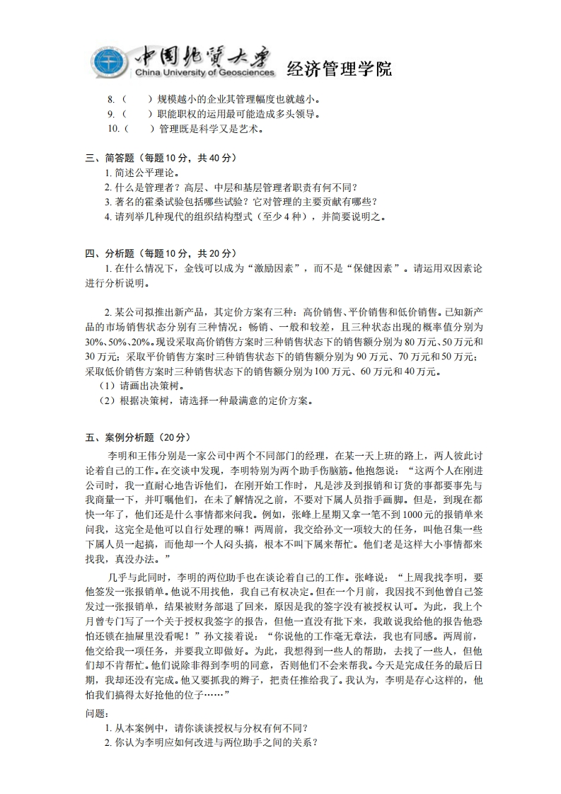 中国地質大China University of Geosciences经济管理学院2019-2020年《管理学》第二学期期末试卷一、单项选择题(每题1分,共10分)1.在火灾现场,消防队长最有效的领导方式是A.独裁式领导B.民主式领导C.放任式领导D.都不对2.某企业的人大代表在开完人代会以后,将会议精神通过会议的形式传达给自己的下级,其沟通方式是A链式沟通B环式沟通C全通道式沟通D.轮式沟通3.在管理方格图理论中,只注意搞好人际关系并创造一个舒适、友好的工作环境,但不太注重工作效率的领导方式是A.任务型B.俱乐部型C.贫乏型D.团队型4.下述哪一项活动不属于计划活动的范畴A.目标B.策略C.实施D.预算5.某车间主任正在给工人下命令:“时间就是金钱,效率就是生命。大家抓紧干,提前完工有奖!谁耽误生产进度,我绝饶不了他!”对这一命令最恰当的评价是A该车间主任管理工人简单粗暴,不懂得强化理论B.是一种不讲究管理的科学性和艺术性相结合的管理方式C该车间主任管理工人简单粗暴,采用的是一种落后的管理方式D.是一种只讲效率不讲效果的落后管理方式6.以下几种现象中不能用需求层次理论进行合理解释的是:A.一个饥饿的人冒着生命危险去寻找食物B.穷人很少参加排场讲究的社会活动C在陋室中苦攻“哥德巴赫猜想”的陈景润D.一个安全需要占主导地位的人可能因为担心失败而拒绝接受富有挑战性的工作7.一家产品单一的跨国公司在世界许多地区拥有分支机构,该公司的组织结构应考虑按什么来划分部门:A人数B地区C.职能D.产品8.职能职权的运用最有可能造成A.多头领导B.沟通障碍C.削弱直线职权D.无人负责9.下列几项活动中,不属于管理活动的是:A钢琴家制定自己的练习计划B.企业的主审计师对财务部门进行检查C.部队中班长与战士的谈心D.医院的外科主任主持会诊10.若较低一级管理层次作出决策的数目越多,影响面越大,则说明该组织:A集权程度越高B.分权程度越高C.士气越高D.以上都不是二、判断题(如正确,请在()内打√;如错误,打X。每题1分,共10分)1.()泰勒的科学管理论的中心问题是制定定额。2.()法约尔提出了非正式组织的问题。3.()管理的核心是处理各种人际关系。4.()当经理解聘员工时,她或他采用的是负强化方式。5.()组织内管理层次的多少和组织内部门的多少可衡量组织分权的程度。6.()一个组织可以同时采用多种不同的部门化方式。7.()奖金发得越多,人的积极性越高。