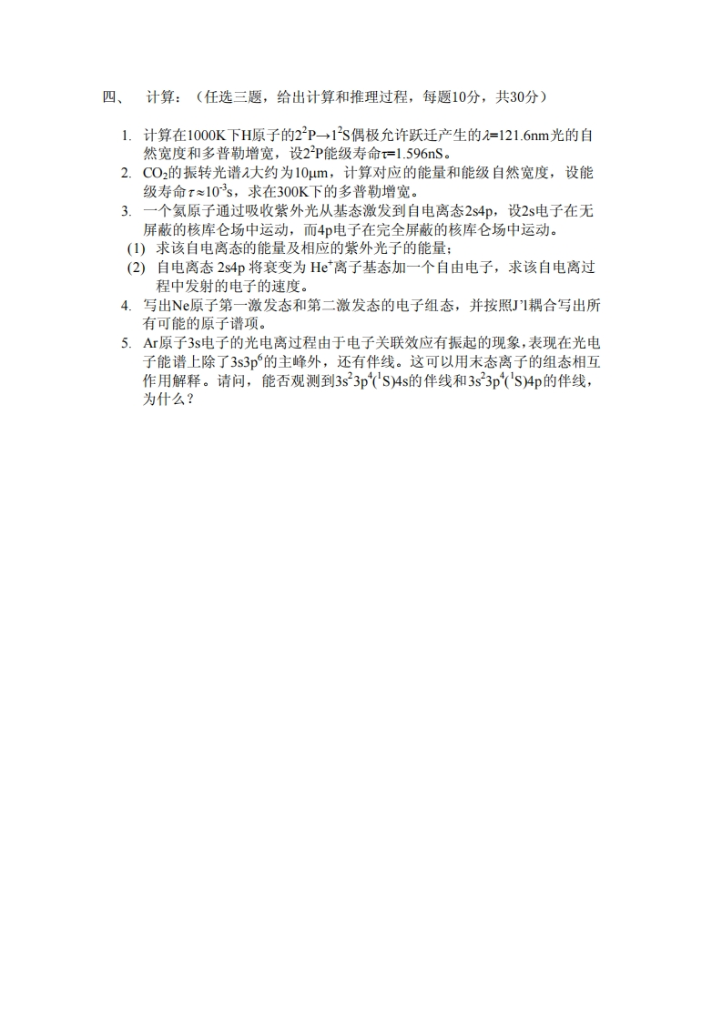 中国科学技术大学高分子物理期末试题(2021.1.16)请简要说明下列物理现象或简要解释下列物理名词:(每题4分不超过50字,共20分)1.Fechbach共振(以低能电子与H原子散射为例说明)2.量子数亏损3.组态相互作用4.分子轨道5.超弹性散射二、请回答下列问题:(每题9分不超过100字,共18分)1.双原子分子的势能曲线有那儿类?什么是Koopmans电离势、绝热电离势和垂直电离势?它们的相对大小?那个接近实验值?多原子分子的势能函数是什么样?2.试描述LS、和Jl耦合?三、填空:(每空格2分,共32分)1.H原子的相对论修正项包括:2P2.2态中等于零的修正项是2S2态中等于零的修正项是;2P2态比2P2态能量高的原因是2S2态能级比2P2态能级原因是2.谱线的自然线宽是由于引起的,其线形是:原子分子间的碰撞无辐射退激发会导致激发态能级寿命,由此引起的谱线增宽称为其线形是:原子分子相对于光源或探测器的相对运动而引起的谱线增宽称为其线形是;如果上述因素均存在且可比,则实际谱线的线形是3.02分子的基态电子组态是形成的分子电子态谱项有一,和一。第一激发态电子组态是4.H原子核的自旋I=,H2分子的总核自旋T=和,T=」的称为正类分子,T=的称为仲类分子,正类分子和仲类分子的布居数比为■