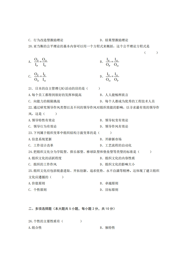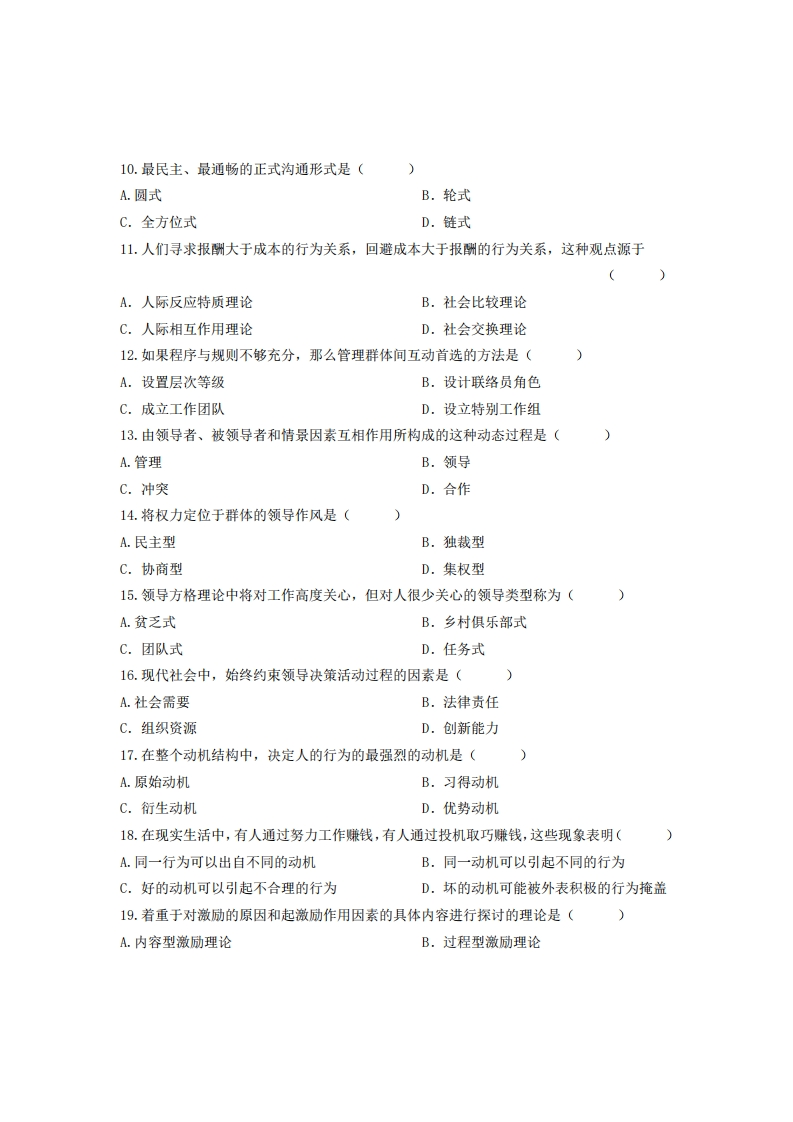 中国科学技术大学《组织行为学》2020-2021学年第一学期期末试卷一、单项选择题(本大题共25小题,每小题1分,共25分)1.组织行为学的研究对象是(A.一切人的行为B.一切人的心理活动C.一定组织中的人的心理与行为D.一切人的心理与行为2.组织最基本的构成要素是(A.个体B.群体C.团队D.部门3.度量离中趋势常用的指标是(A.简单算术平均数B.加权算术平均数C.标准差D.中位数4.按有无价值的不同标准来划分,美国组织行为学家史布兰格把人的价值观分为(】A.五类B.六类C.七类D.八类5.更喜欢利用取得工作成就的工作场所的是()A.内因控制论者B.外因控制论者C.A型性格的人D.B型性格的人6.创造性行为最显著的特点是(A.系统性B.开放性C.社会性D.主动性7.个人在组织内事业生涯变动的模式呈现出的是一个(A.圆柱体B.圆锥体C.正方体D.圆球体8.-般来说,在执行任务时,较为有效的群体是()A.利益型群体B.友谊型群体C.同质性群体D.异质性群体9.在群体压力下,个体产生与群体行为保持一致的倾向,这种效应是(A.协同效应B.群体促进效应C.从众效应D.社会惰化效应