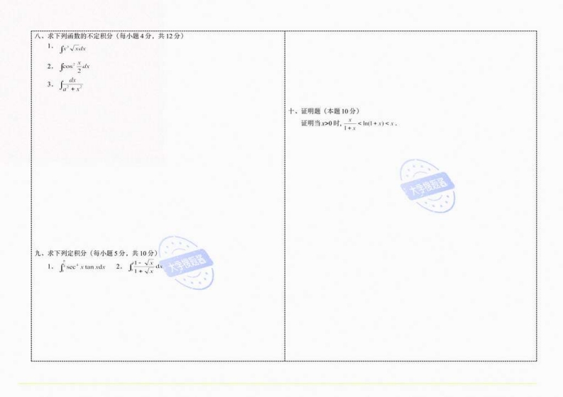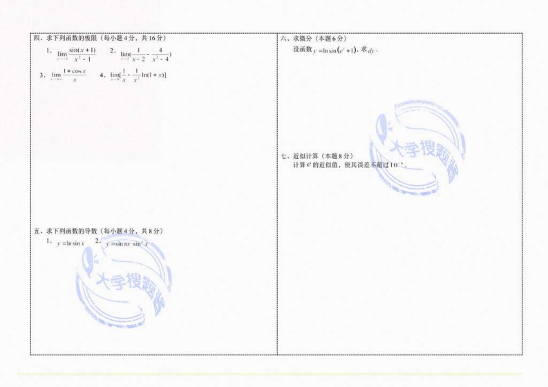 中国民航大学《高等数学》2019-2020学年第一学期期末考试卷学院专业深程,共3氨。第1页,共印刷份,年月日考试。任课教师报题教研蜜题号三四五六七九十一+二总分备注得分阅卷教师签名一。判断题(每小题2分,共10分)1,函数/4x)-树在x■0处是连续的()5.设xw=+c,则)=()·2.在x一0时,snxanx的无穷小的阶数是2阶的()A.2eD.+C3.,若在点、不连线.则/在、必不可导。()B.C.e如4.若/∈CX).则3FeDX).使得Fx)=f).()三,填空题(每小题2分,共10分)5,设区间xGR,/EDX),则f在X上图形是凸的的充要条件是广(x)在X1.1上是严格增的。已知)一x一1,若在(.+)内连续。则a=x=1二,选择题(每小题2分,共10分)1.函数/)=xm的间断点x=0的类型为()2.函数,=x+,在区间-1,2上的最小值为A,可去型B。跳跃型C,振荡型D,无穷型3.im0(v月+1-√0-2)=2.数列m+己++)和m+了-分分别是()2B.24.函数+t,的导数是A.C.D.2.25,设函数/∈(a,l,且(x)是奇函数或偶函数,则当/为奇函数时3。下列函数在指定区间上单调诚少的是(),了八x=0,当/为锅函数时广/h=紧A.sinrB.e'C.x D.3 x4.设()在,b连续,则由线y=人与直线xg,x=b所围平面图形的面积为()A.了(B.fronc.fD.()(h-a)a