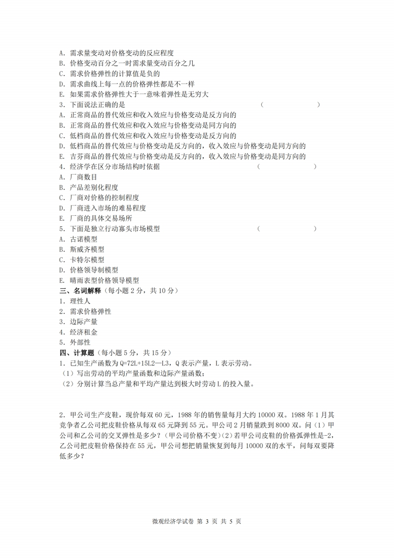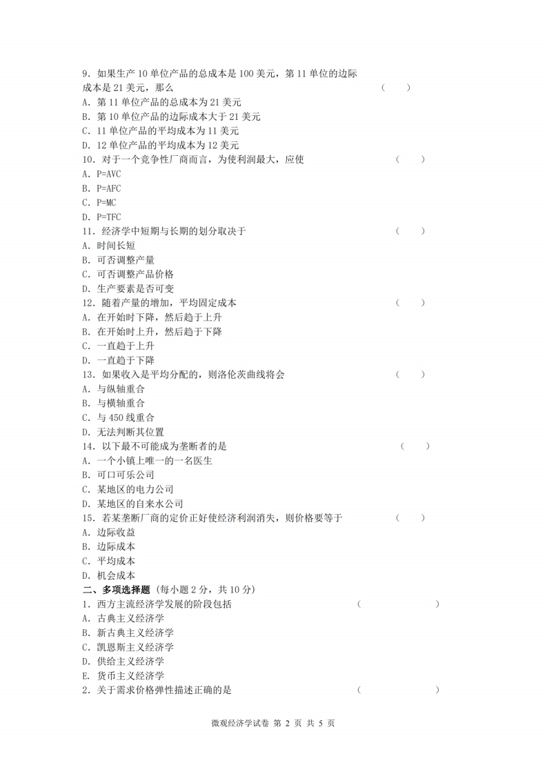 中国农业大学《微观经济学》2021-2022第二学期期末试卷一、单项选择题(每小题1分,共15分)1.亚当·斯密写了():凯恩斯写了(A.国富论就业、利息与货币通论B.就业、利息与货币通论国富论C.国富论资本论D.看不见的手就业、利息与货币通论2.假定需求表中D1、D2、D3、D4的弹性系数分别为2.3、0.40、1.27、0.77,在价格提高后将导致总收益的增加的是A.D1和D3B.D3和D4C.D2和D4D.仅D13.某消费者的收入下降,而他对某商品的需求却增加,该商品为A.低档商品B.互替商品C.互补商品D.一般商品4.政府把价格限制在均衡价格以下可能导致,A.黑市交易B.产品过剩C.均衡价格上升D.均衡价格下降5.无差异曲线上任意一点两种商品的边际替代率等于它们的A.价格之比B.消费数量之比C.边际效用之比D.边际成本之比6.预算线绕着它与横轴的交点向外移动的原因是A.商品X的价格下降了B.商品Y的价格下降了C.商品X和Y的价格按同一比率上升了D.消费者的收入增加了7.如果连续地增加某种生产要素,在总产量达到最大时,边际产量曲线()A.与纵轴相交B.与横轴相交C,经过原点D.与平均产量曲线相交8.等成本线平行向右上方移动,表明A.产量提高了B.成本增加了C.生产要素的价格按相同比例提高了D.生产要素的价格按不同比例提高了微观经济学试卷第1页共5页