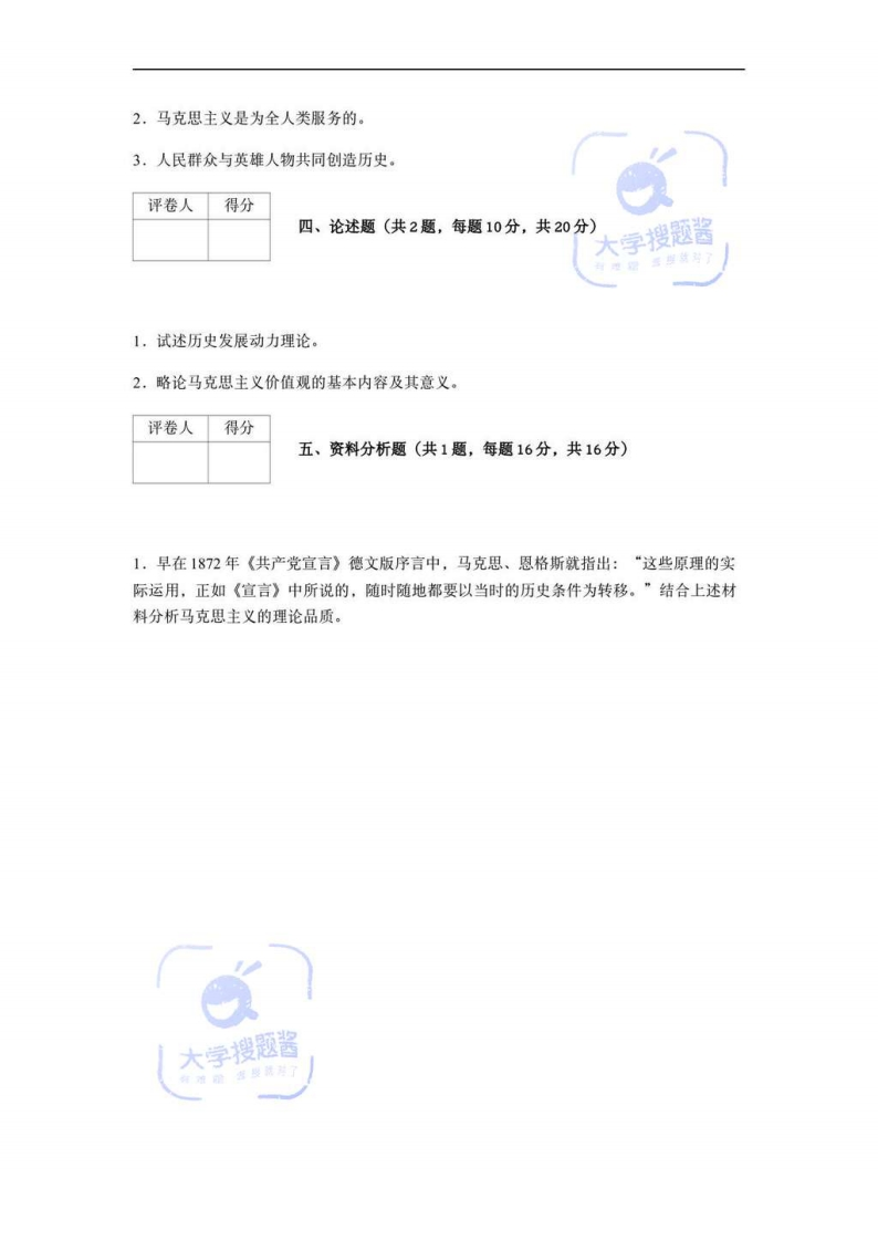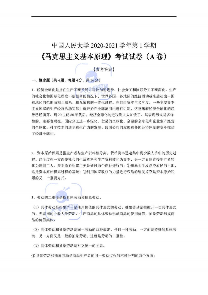 中国人民大学2020-2021学年第1学期《马克思主义基本原理》考试试卷(A卷)考试范围:《马克思主义基本原理》:满分:100分:考试时间:120分钟院/系年级专业姓名学号题号三四五总分得分注意事项:1.答题前填写好自己的姓名、班级、考号等信息2.请将答案正确填写在答题卡上评卷人得分一、概念题(共4题,每题4分,共16分)1.经济全球化2.资本原始积累3.劳动的二重性4.资本积累评卷人得分二、简答题(共4题,每题6分,共24分)学搜题1,为什么认识是一个不断反复和无限发展的过程?2.社会历史与自然界有何不同?3,简述通货膨胀和通货紧缩的产生及其危害。4.如何理解社会主义民主是新型民主?评卷人得分三、辨析题(共3题,每题8分,共24分)1,垄新利润就是平均利润。